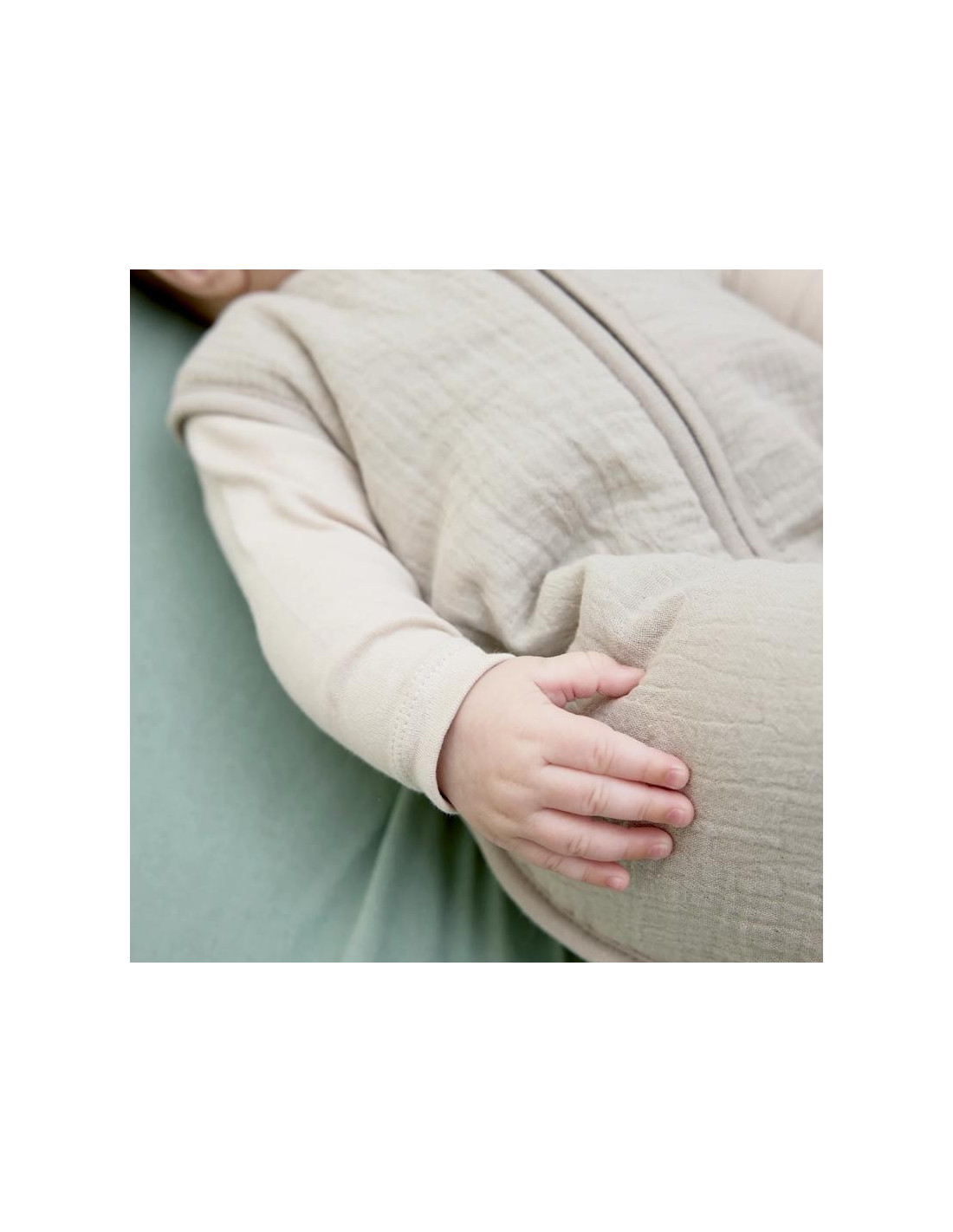 El saco de dormir forrado de muselina Meyco Baby está disponible en diferentes colores de moda. Gracias a ello, el color del saco siempre combina con la habitación del bebé y con el resto de su conjunto. El saco de dormir forrado de muselina prelavada está hecho de 100 % algodón suave y tiene un relleno de 100 % poliéster. Esto lo hace ideal para primavera y otoño, así como para los días y noches más fríos de invierno. El algodón de muselina es muy transpirable, absorbe la humedad de forma excelente y se seca muy rápido. Esto mantiene el entorno de descanso de tu pequeño a la temperatura perfecta.
