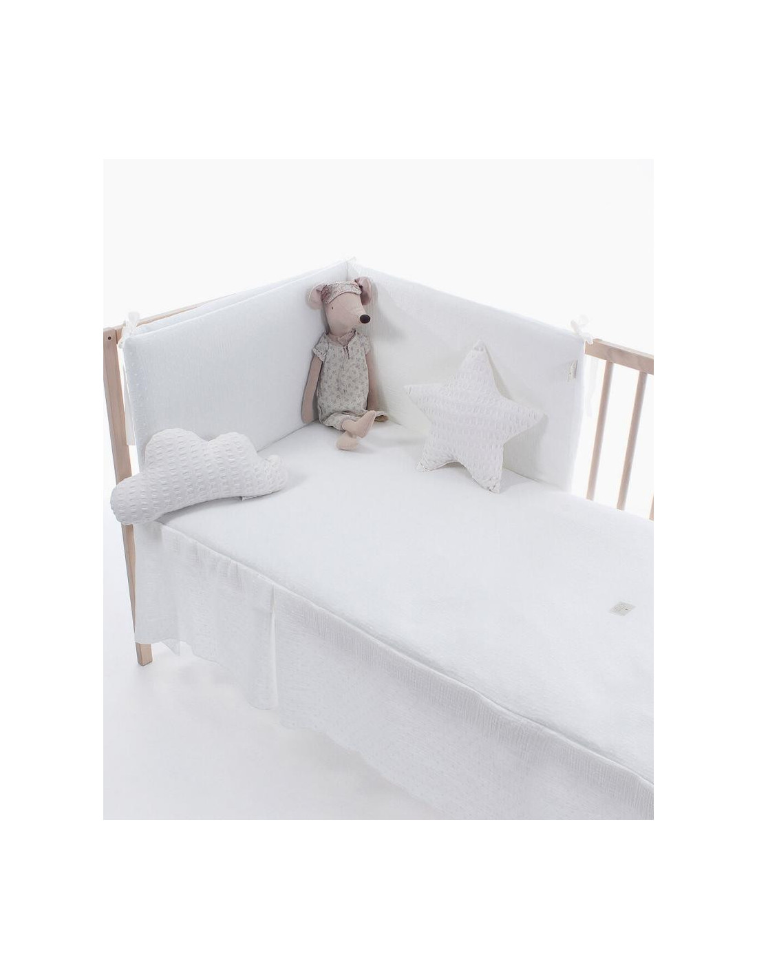 Pack de colcha y protector desenfundable con tejido lavable, relleno incluido y almohada. El protector es doble cara. El protector evita corrientes de aire y protege al bebé de golpes en los laterales de la cuna, impidiendo que manos o pies se introduzcan entre los barrotes. Se ajusta de forma segura y sencilla a la estructura. La colcha, coordinada con el protector, es versátil y práctica: en invierno, el relleno mantiene al bebé cálido