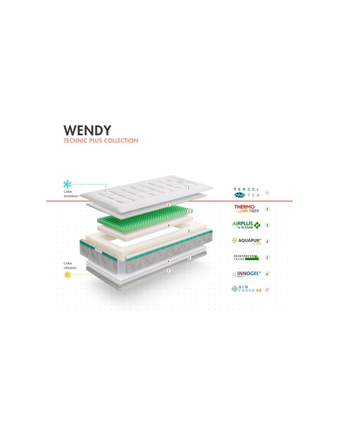 El colchón Wendy, de nuestra Serie Technic Plus Collection, es una excelente opción gracias a la espuma suave perfilada Airplus y la visco Innogel que forman su nucleo, y que se adaptan al cuerpo y cabeza del bebé haciendolo ergonomicamente perfecto. Convierten a este colchón en un soporte ideal para utilizarlo desde el nacimiento del bebé.