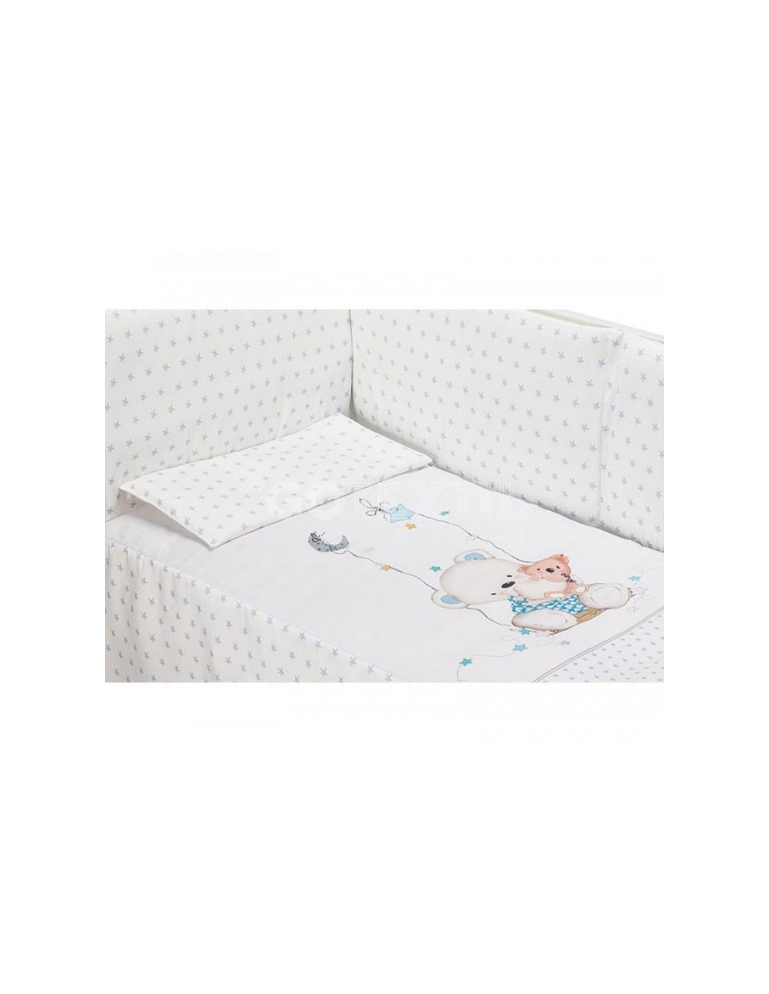 Edredón cuna y Almohada con protector Chichonera modelo COLUMPIO color azul. Fabricada por Interbaby con tejido 100% algodón y son desenfundables para facilitar su lavado. Puedes sacar el relleno del edredón y utilizarlo como colcha para primavera y verano. El relleno de la chichonera es de fibra hueca siliconada para proteger al bebé dentro de la cuna.