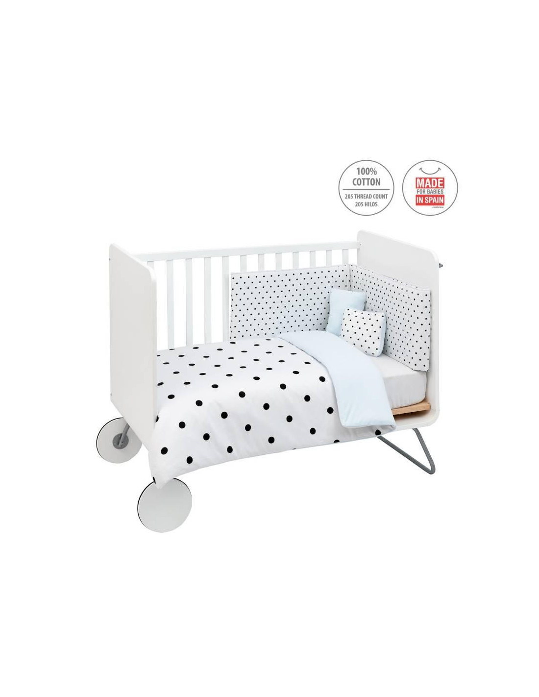 Todo el juego está compuesto por tejidos algodón de 205 hilos, lo que hace una suavidad extraordinaria para estar en contacto con la piel de los bebes, MADE IN SPAIN.