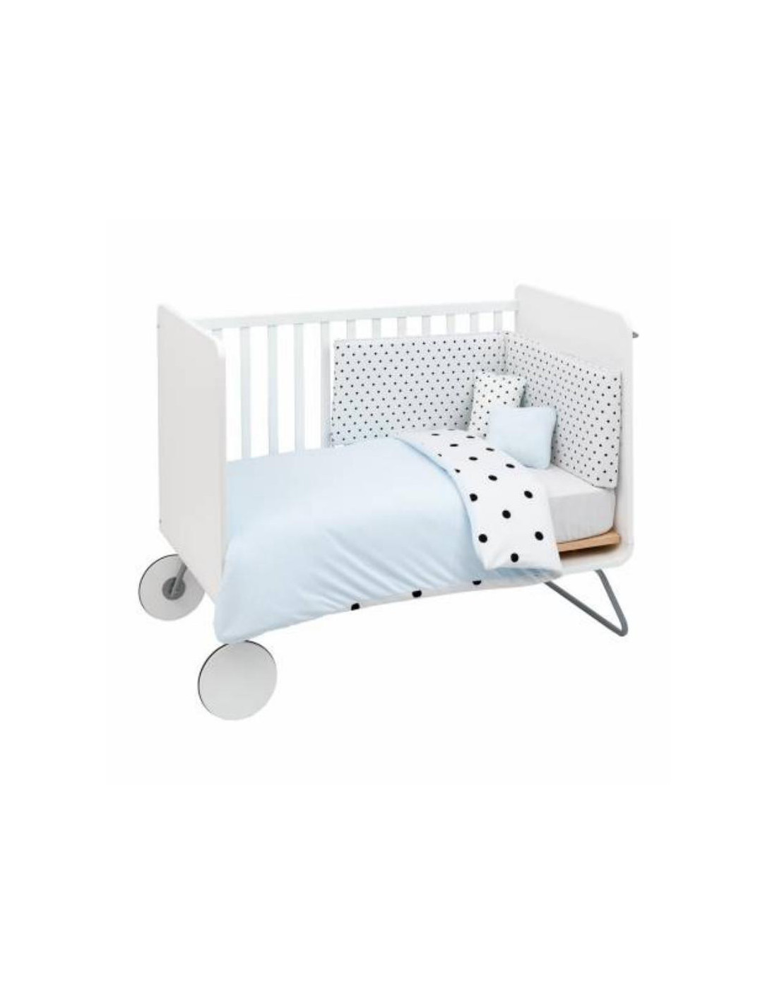 El juego de 4 piezas de cuna de Cambrass, está compuesto por un protector de 3 partes con 8 puntos de agarre a la cuna, un nórdico de algodón que puede ser reversible (el relleno del nórdico está compuesto por fibras que mantienen la temperatura corporal del bebé con una suavidad extrema) y 2 cojines de formas diferentes que aparte de hacer un complemento ideal para la decoración, también los utilizará él bebe una vez que vaya creciendo.