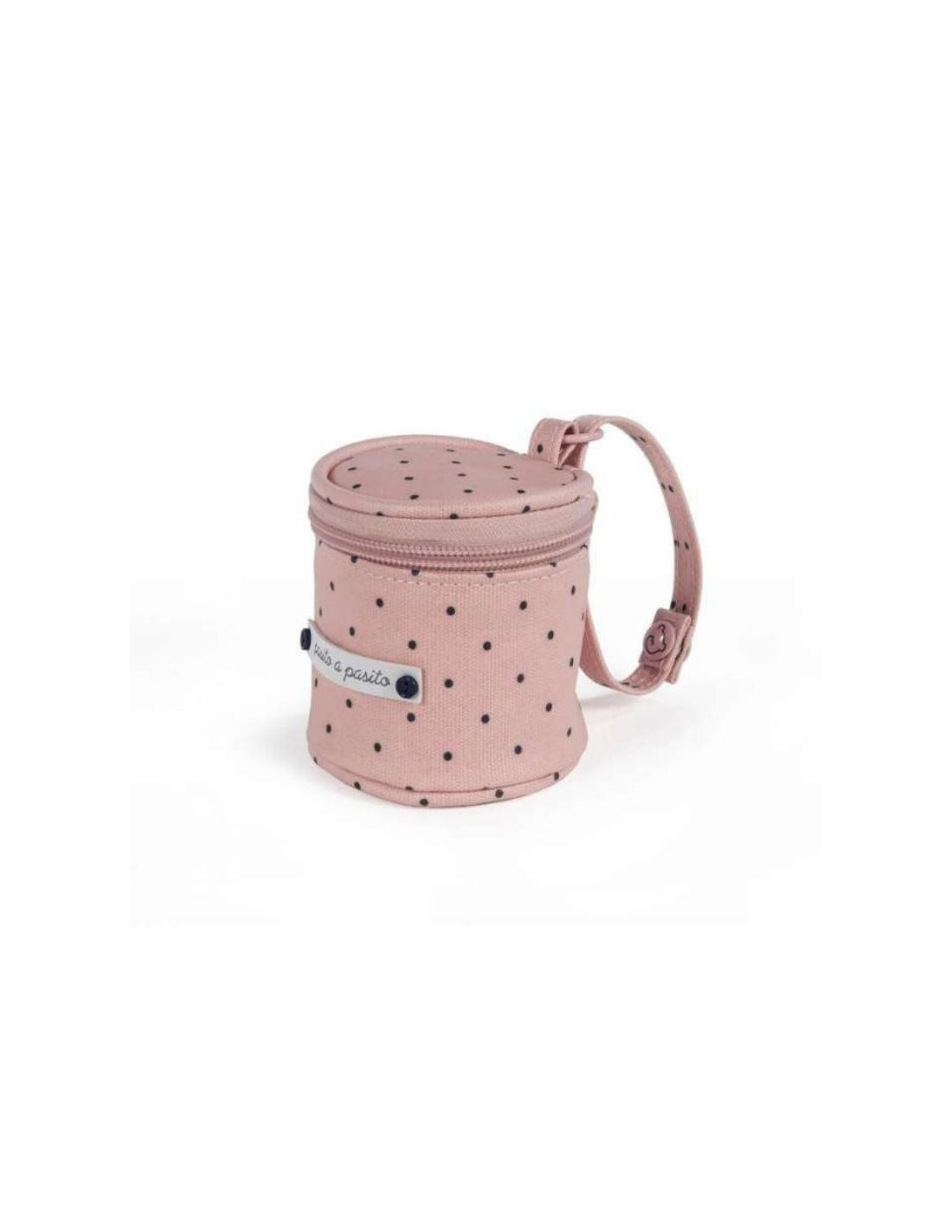 Funda para guardar el chupete de la colección Triana en color rosa con unos sutiles topitos, de Pasito a pasito. Podrás guardar el chupete de tu bebé y colgarlo en la bolsa de maternidad, cochecito, cuna o en cualquier lugar, gracias a su asa con broche.