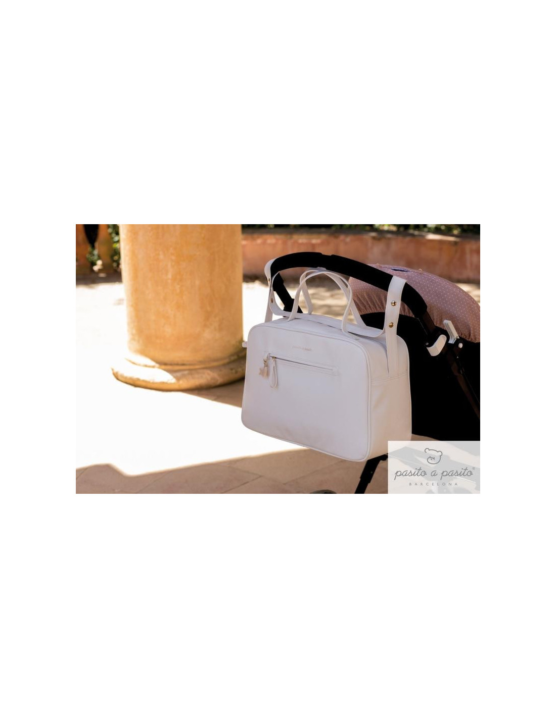 Bolsa canastilla o bolso de maternidad para silla de paseo Elodie de la firma Pasito a pasito. Este bolso se puede colgar de la silla de paseo con los corchetes que trae la asa larga, también del hombro o de la mano con sus dos asas cortas, de manera que lo hace muy práctico. Gracias a su gran capacidad podrás llevar todo lo necesario para el bebé cuando esté fuera de casa. Tanto en su exterior como interior encontrarás varios bolsillos o separadores que te ayudaran a la hora de guardar las cosas para el bebé.