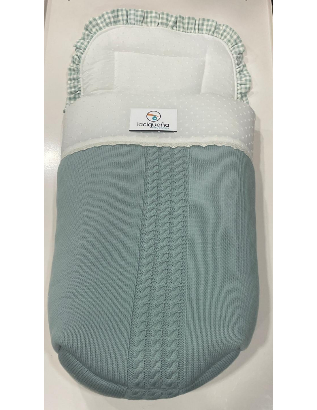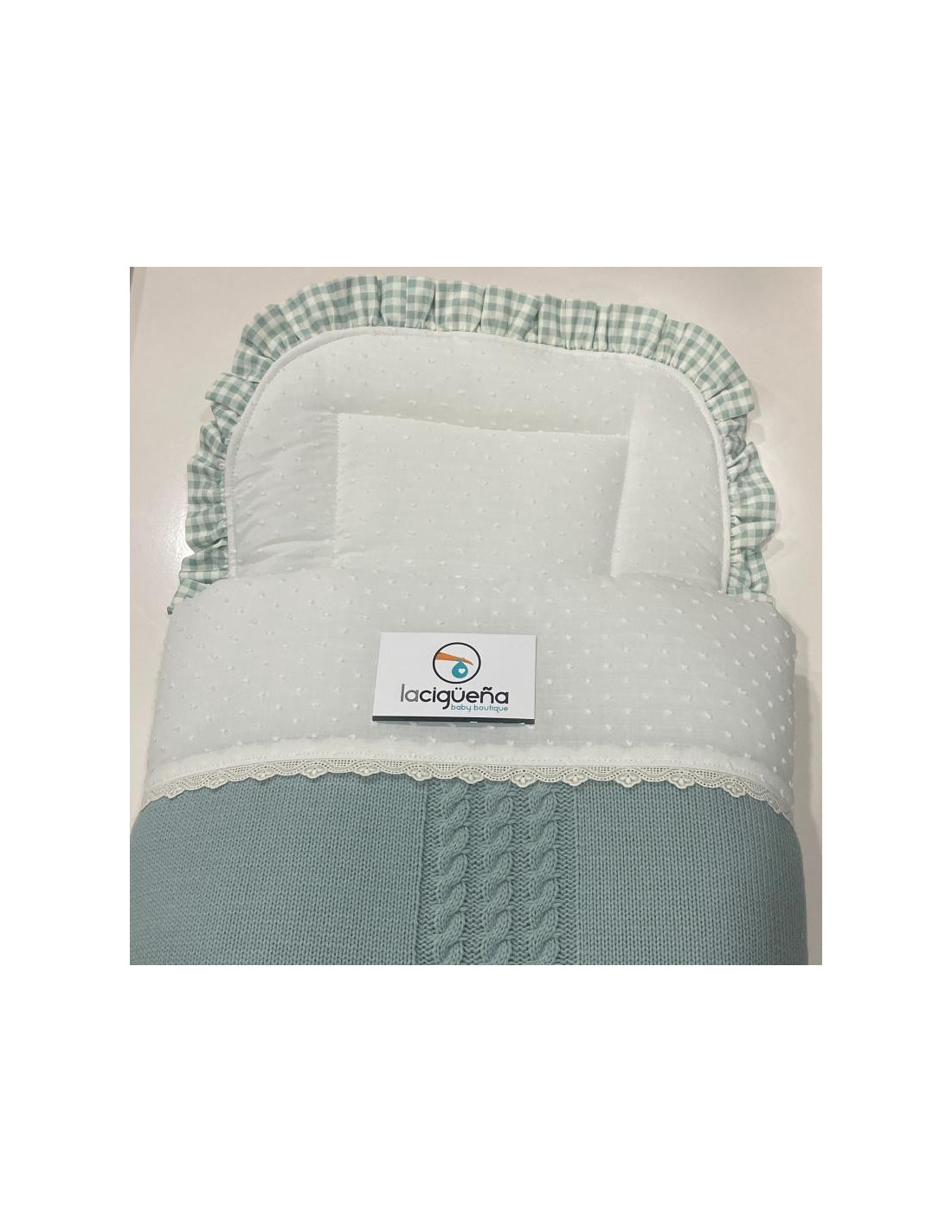 La Colchoneta está fabricada en plumeti con volante de cuadros vichi en verde.