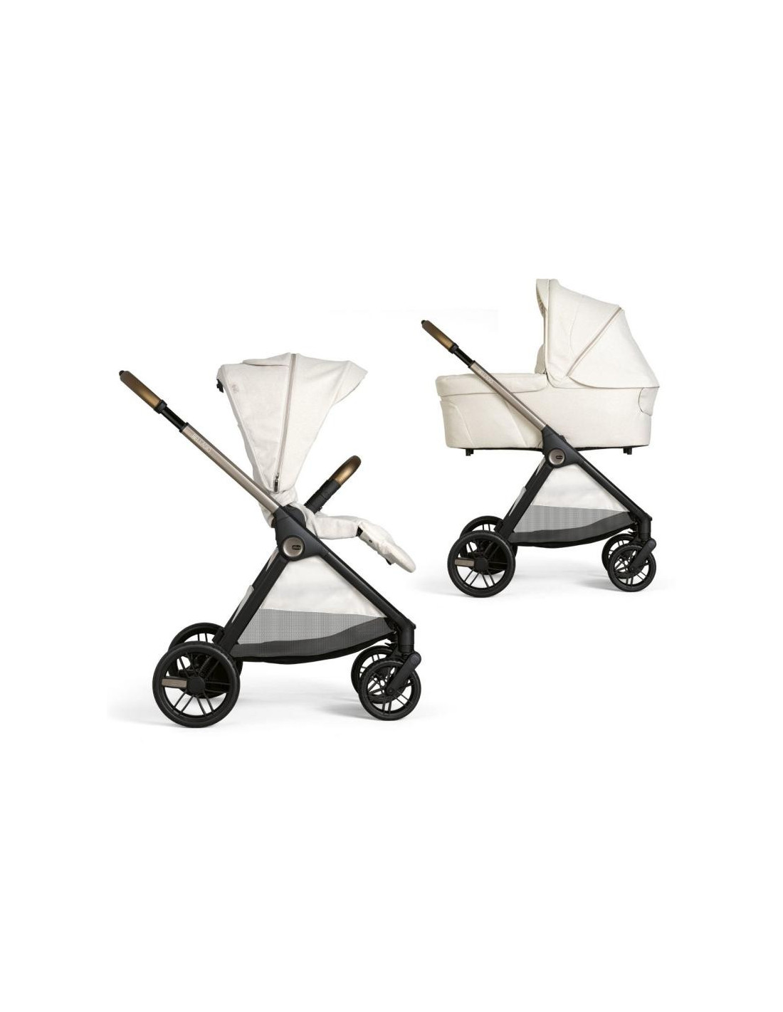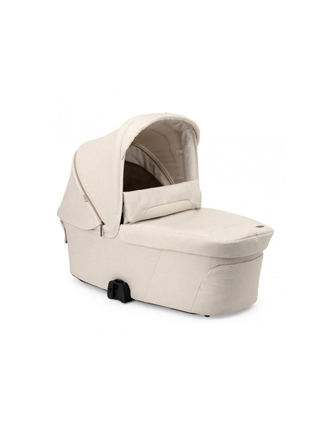 El capazo se fija fácilmente al chasis de los cochecitos Mysa y Bellagio sin necesidad de adaptadores. Liberarlo es rápido y sencillo gracias a los prácticos botones de memoria.