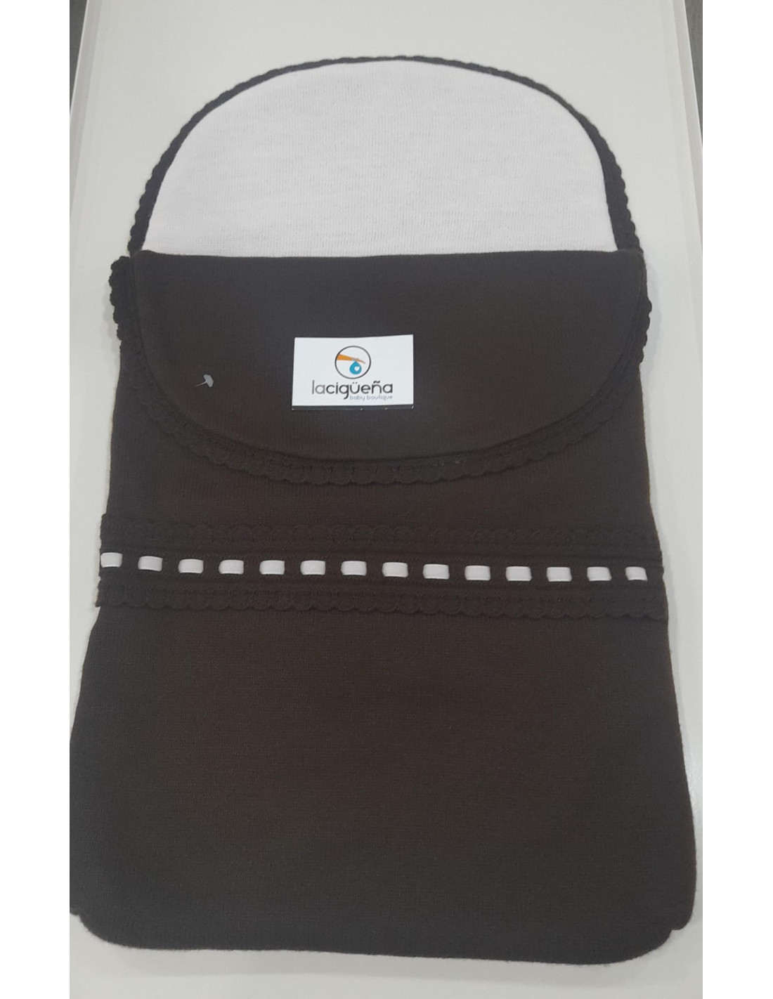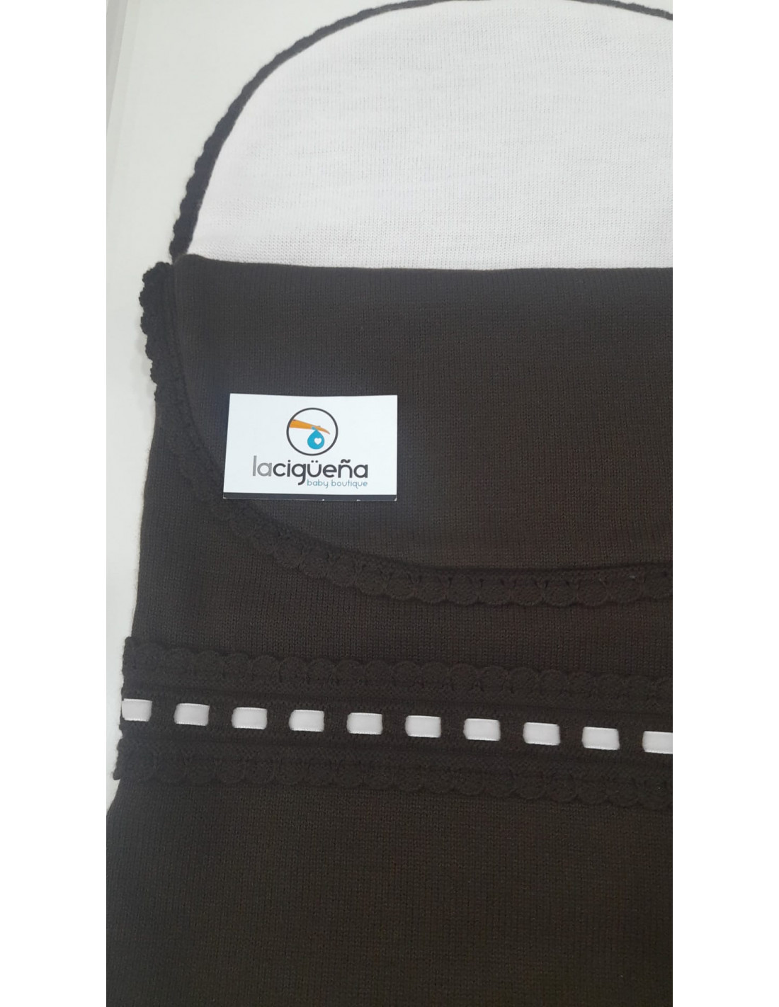 Saco de lana interior en color rosa y decoracion de pasacintas en el cubrepies.