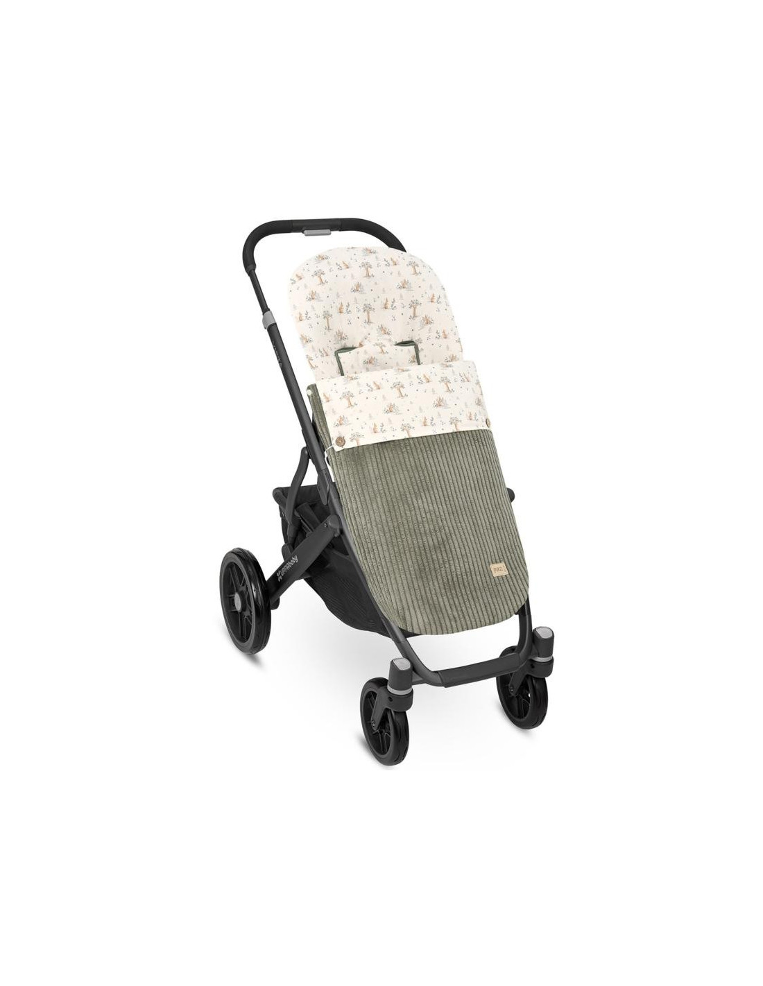 Saco para sillas estrechas de bebé confeccionado en tejido pana ancha exterior combinado con estampado de conejos. Cremalleras laterales para convertir el saco en colchoneta. Relleno extraíble. Colchoneta interior de tela estampada.