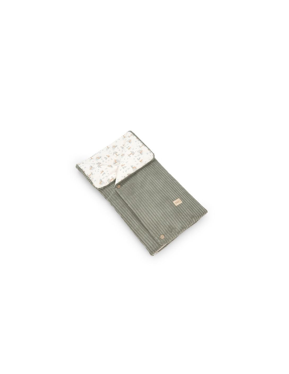 Saco nana con tejido pana ancha exterior y estampado de conejos interior y cierre con botones. Se abre totalmente para usar de cambiador. Tiene ojales traseros para portabebé. Ideal para portar al bebé.