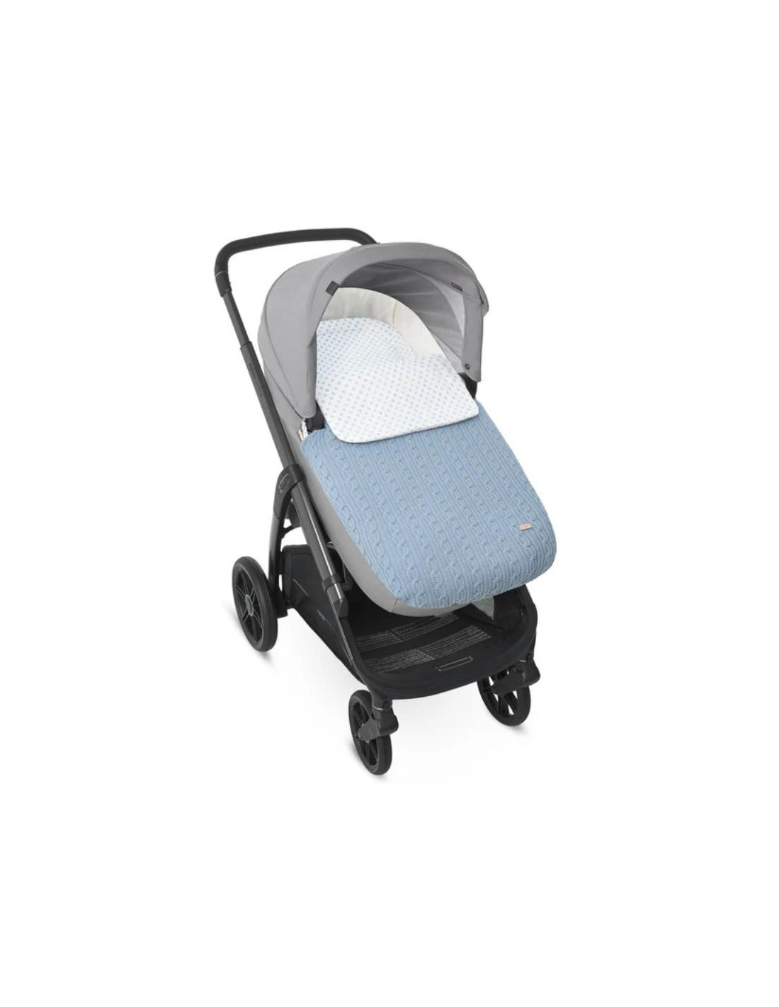 Saco para capazo de bebé confeccionado en punto ochos combinado con viella de lunares. Relleno extraíble. Se adapta a casi todos los capazos del mercado.