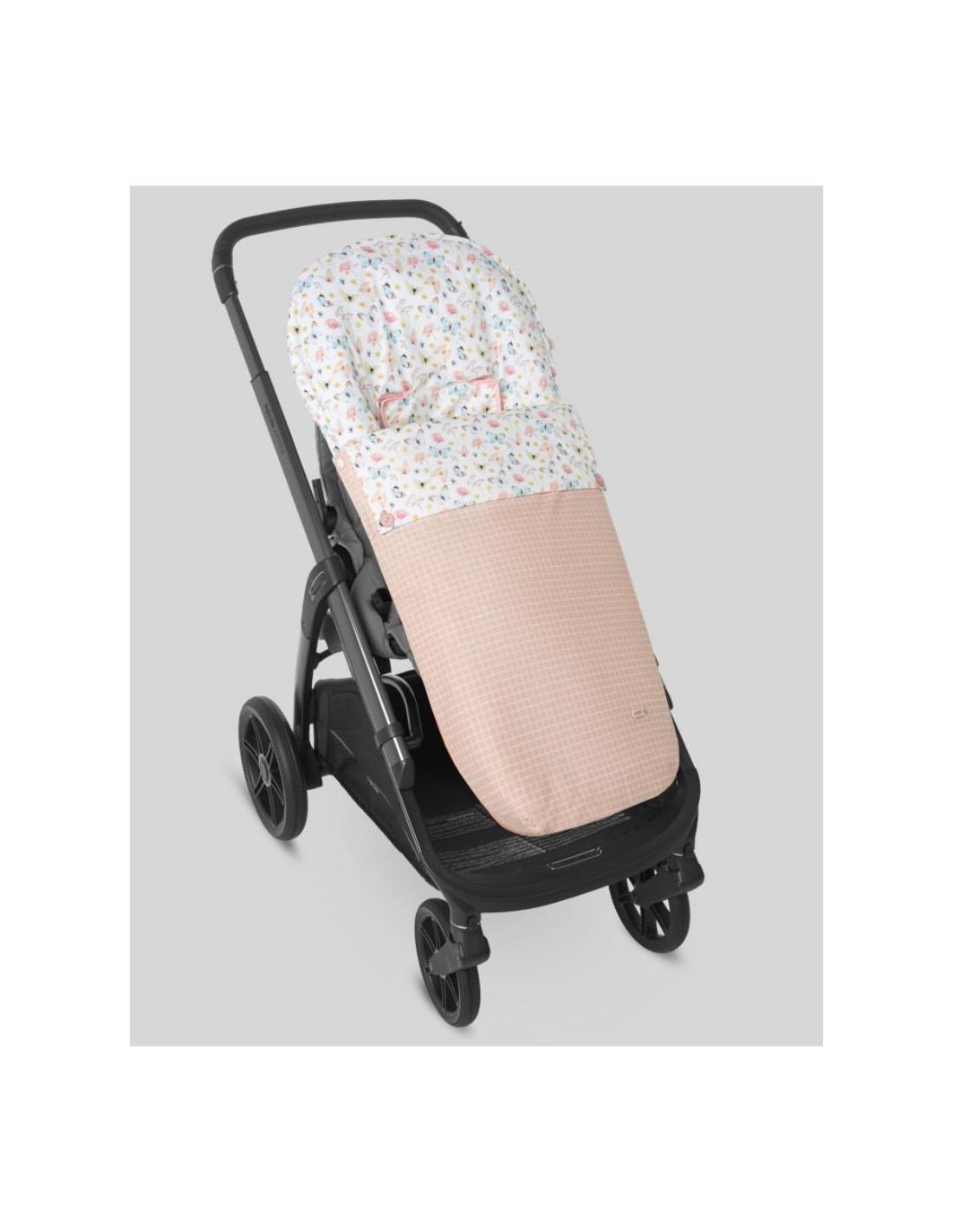 Saco para sillas de paseo confeccionado en popelún cuadros combinado con popelín de estampado mariposas en el interior. Cremalleras laterales para convertir el saco en colchoneta. Refuerzo de polipiel en los pies. Relleno del cubrepiés extraible.