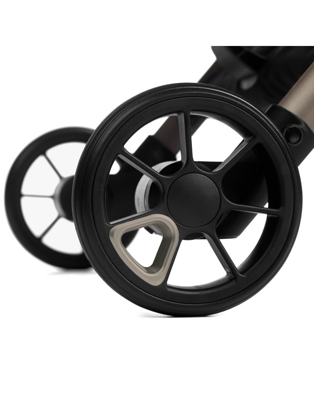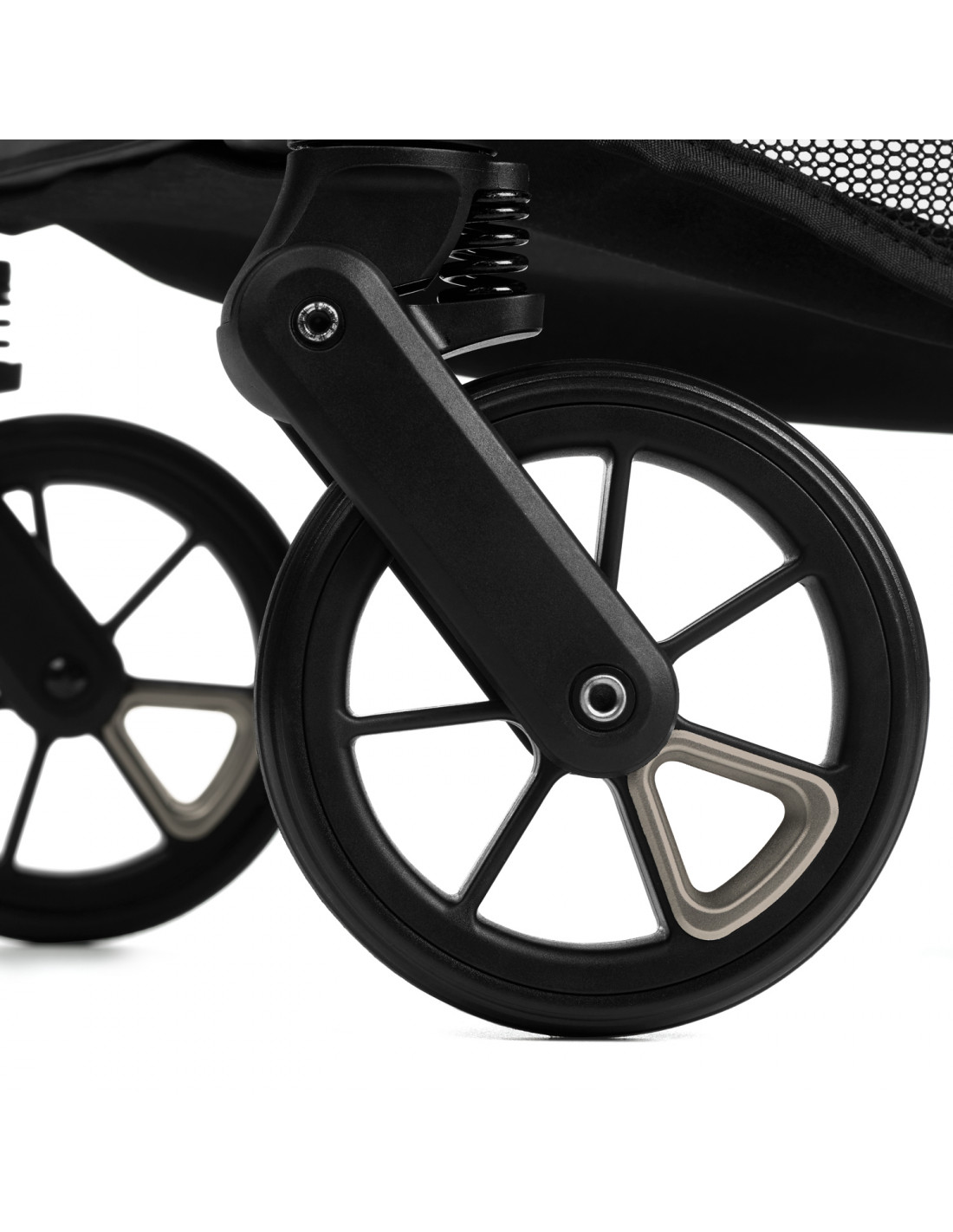 La suspensión en las ruedas delanteras ayuda a absorber irregularidades del terreno, proporcionando paseos más suaves y confortables para el bebé.