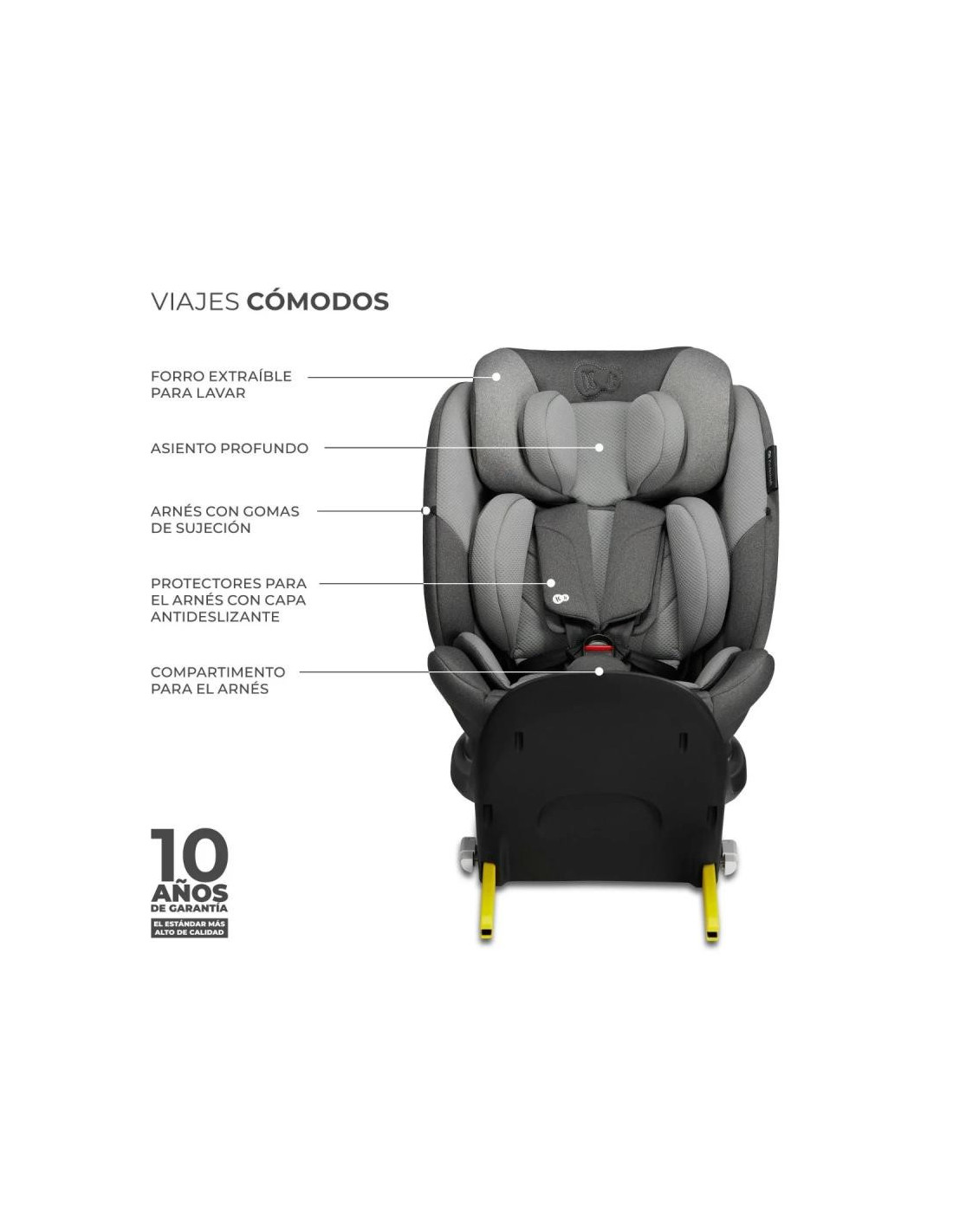 -FIX i-Size es una silla giratoria (40-150 cm) que redefine los estándares de seguridad de viaje. No solo cumple la normativa R129 i-Size, sino que se ha sometido a pruebas en condiciones muy estrictas, como choques frontales y laterales a un 28 % más de velocidad de lo establecido por la norma. Estos análisis permiten comprobar mejor la resistencia contra roturas de la carcasa de la silla, ya que debe aguantar una energía cinética un 50 % superior. La silla protegerá al niño de forma exhaustiva gracias a los sistemas de protección avanzados (H-GUARD+ y SPS+) y la espuma EPP en la carcasa y el reposacabezas.