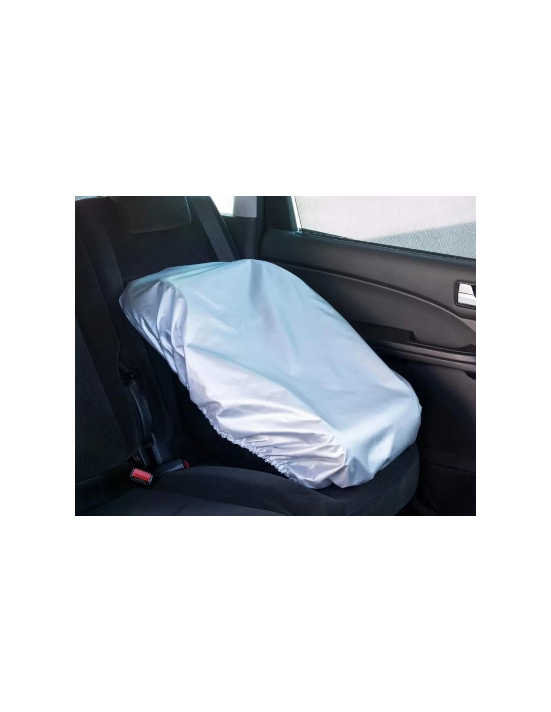 Fabricado en 100% poliéster resistente, su acabado plateado ayuda a reflejar el calor, manteniendo la silla en mejores condiciones. Cuenta con una goma elástica ajustable, lo que facilita su colocación y permite adaptarse a la mayoría de las sillas de coche.