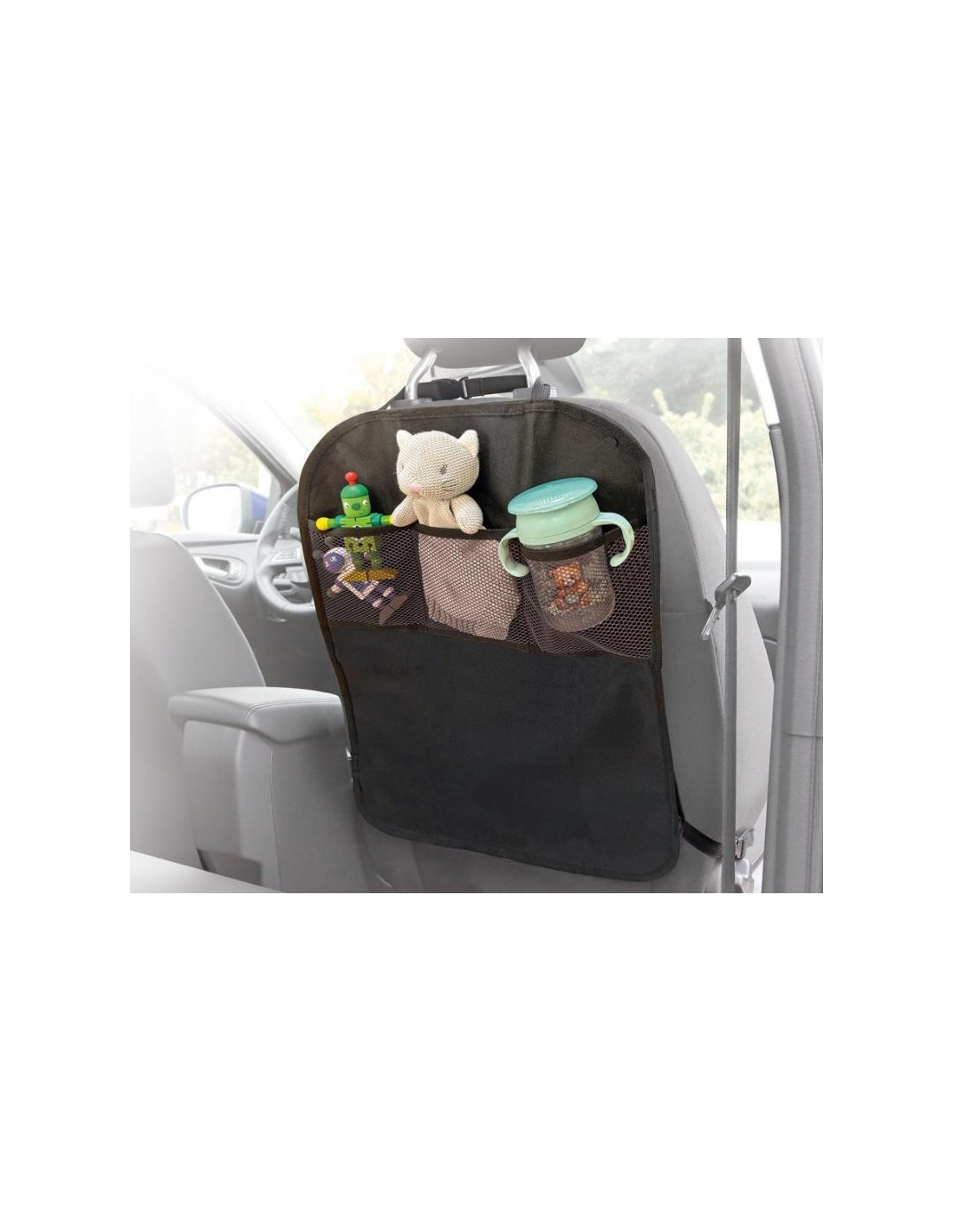 Podrás almacenar juguetes y todo tipo de artículos, gracias a sus numerosos bolsillos de diversos tamaños, mientras proteges la parte trasera del asiento de tu coche.