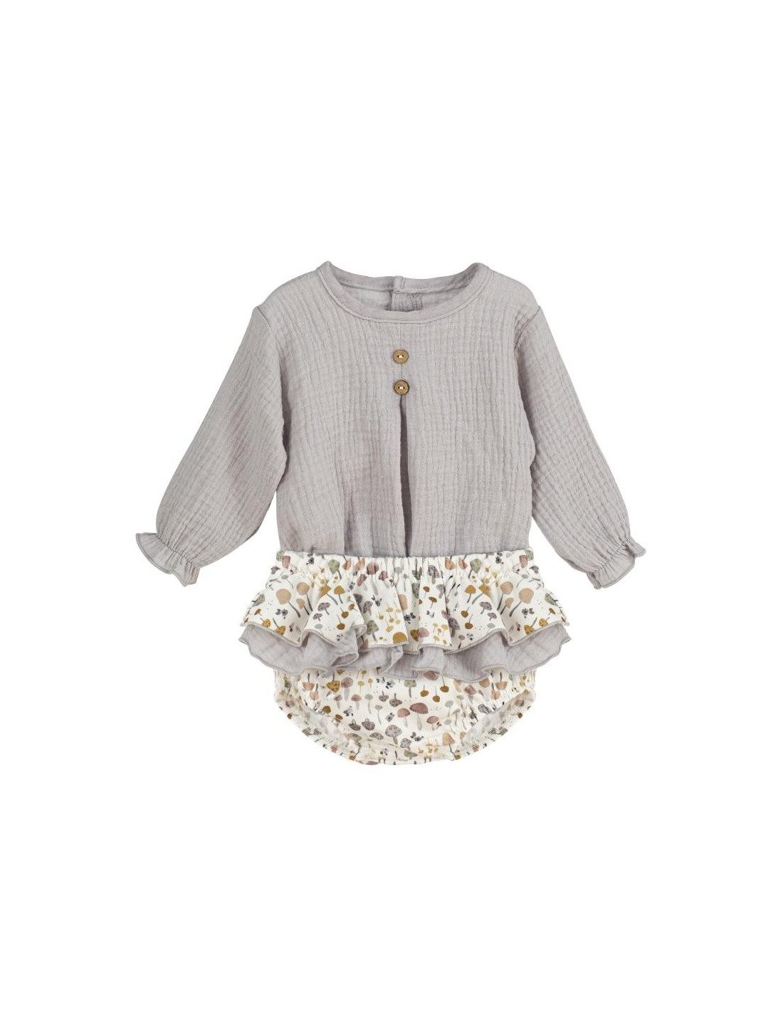 Camisa de manga larga bambula en gris con braquita de volantes con setas.