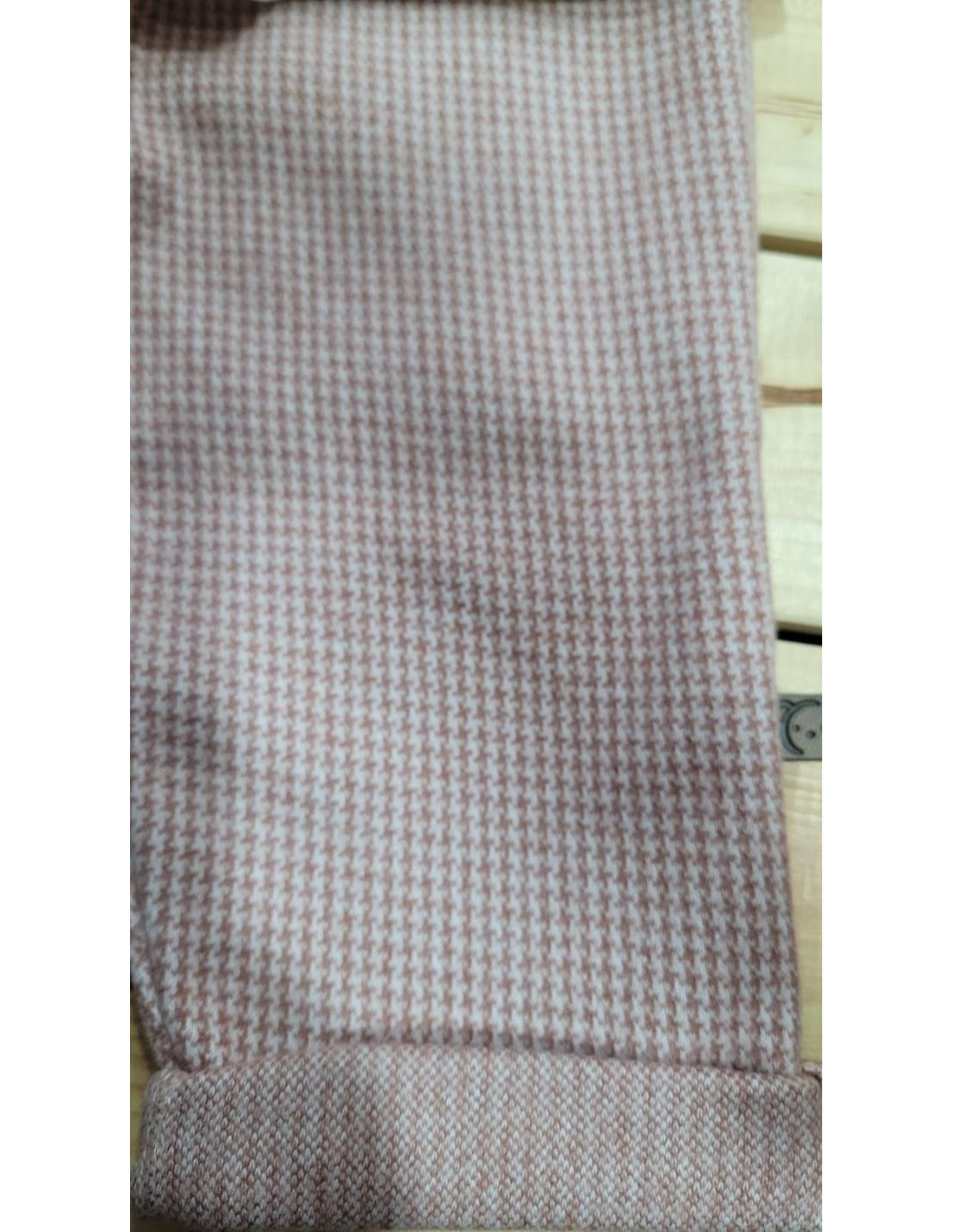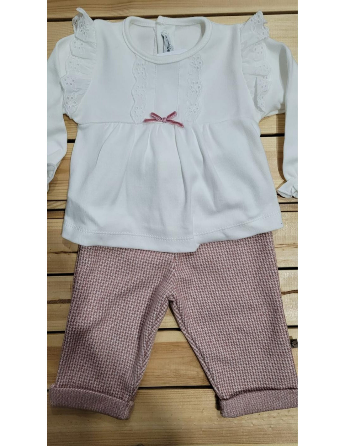 Jersey algodon beig, con detalle de botones en el cuello .El pantalón es largo de punto en cuadritos con vuelta abajo.
