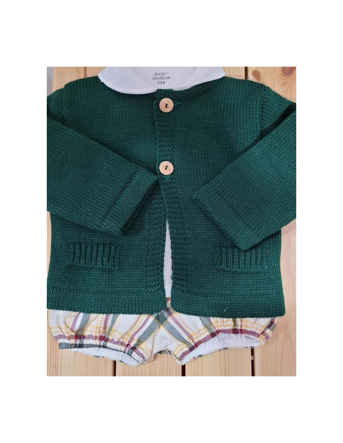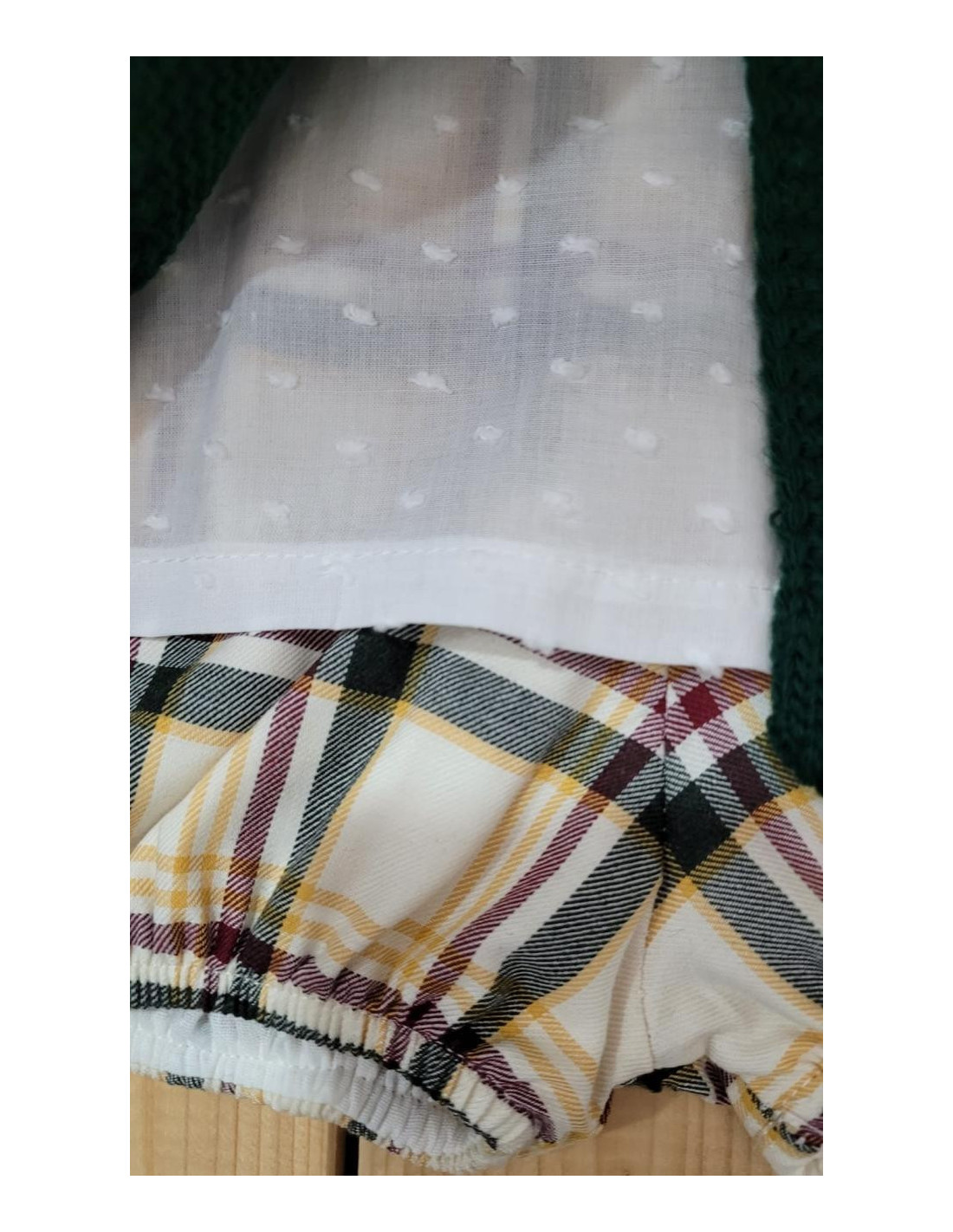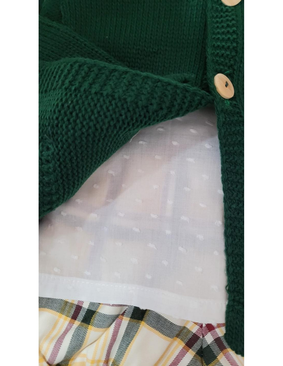 Rebeca lana en verde botella, con camisa de plumeti manga larga y ranita de cuadros en verde y mostaza,