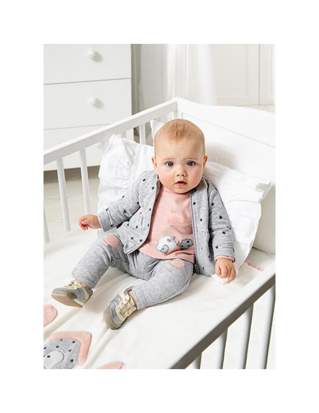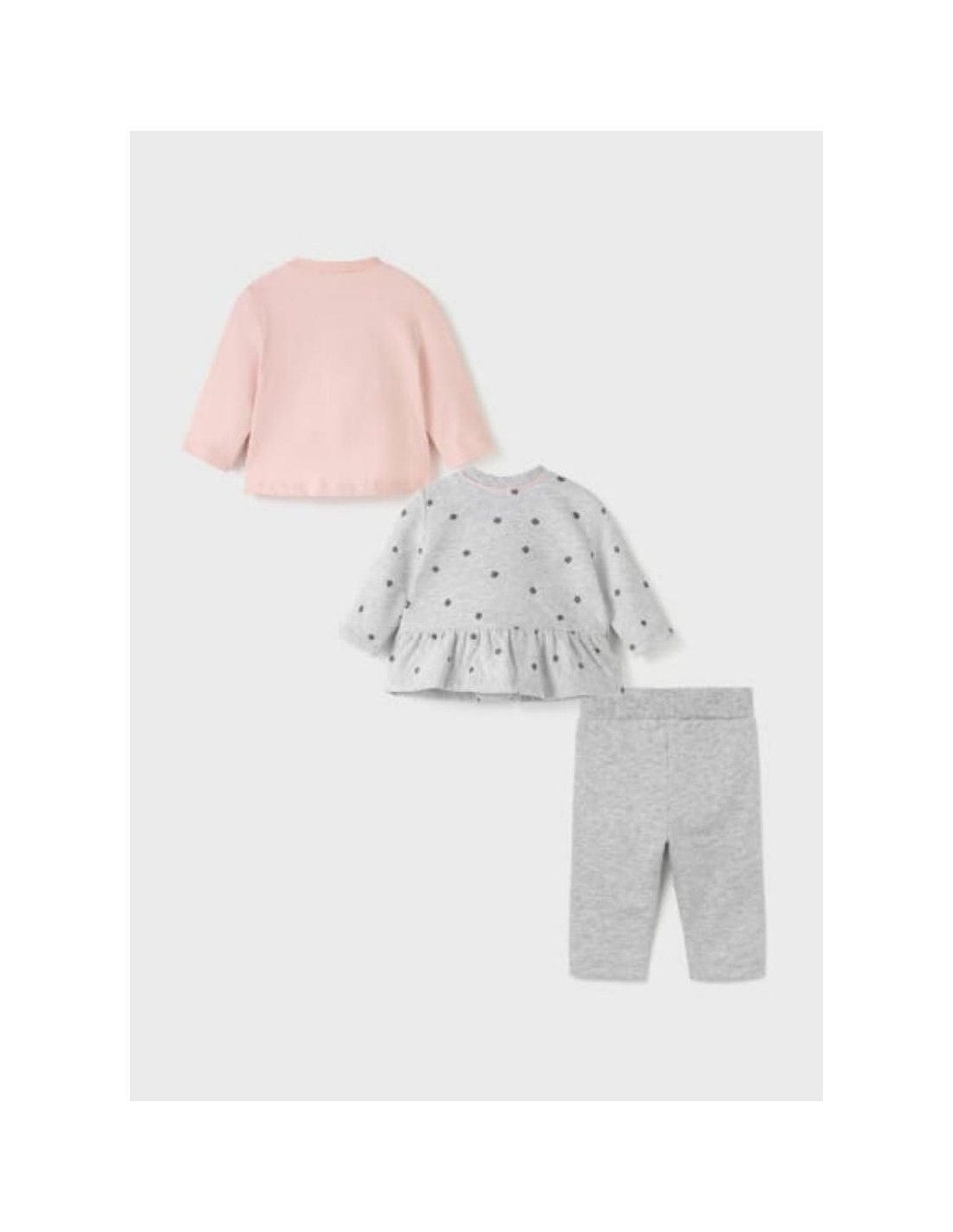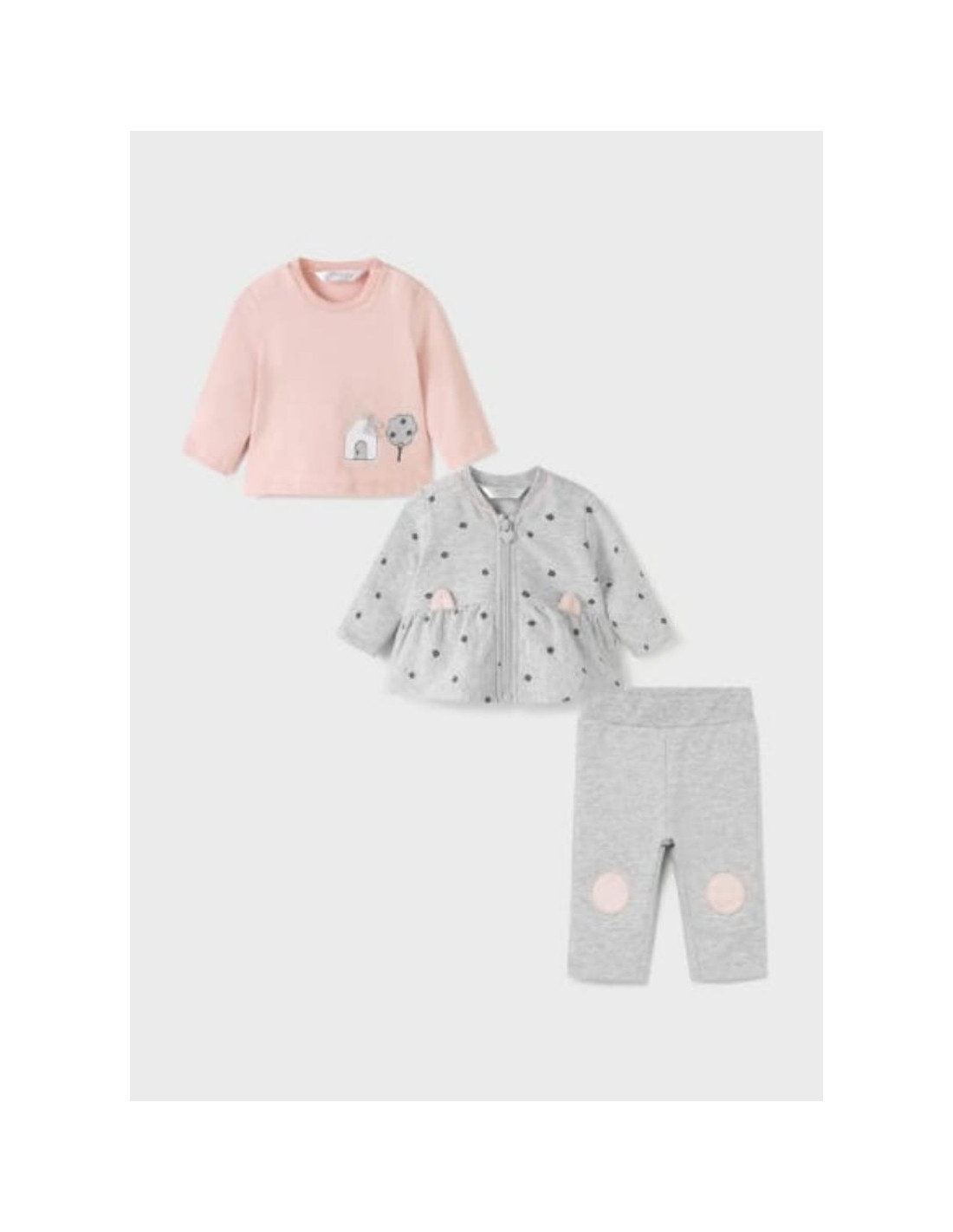 Prenda ECOFRIENDS, contiene algodón sostenible. Chándal de tres piezas para recién nacida niña 0 a 18 Meses compuesto por una sudadera, un pantalón largo deportivo y una camiseta a juego.