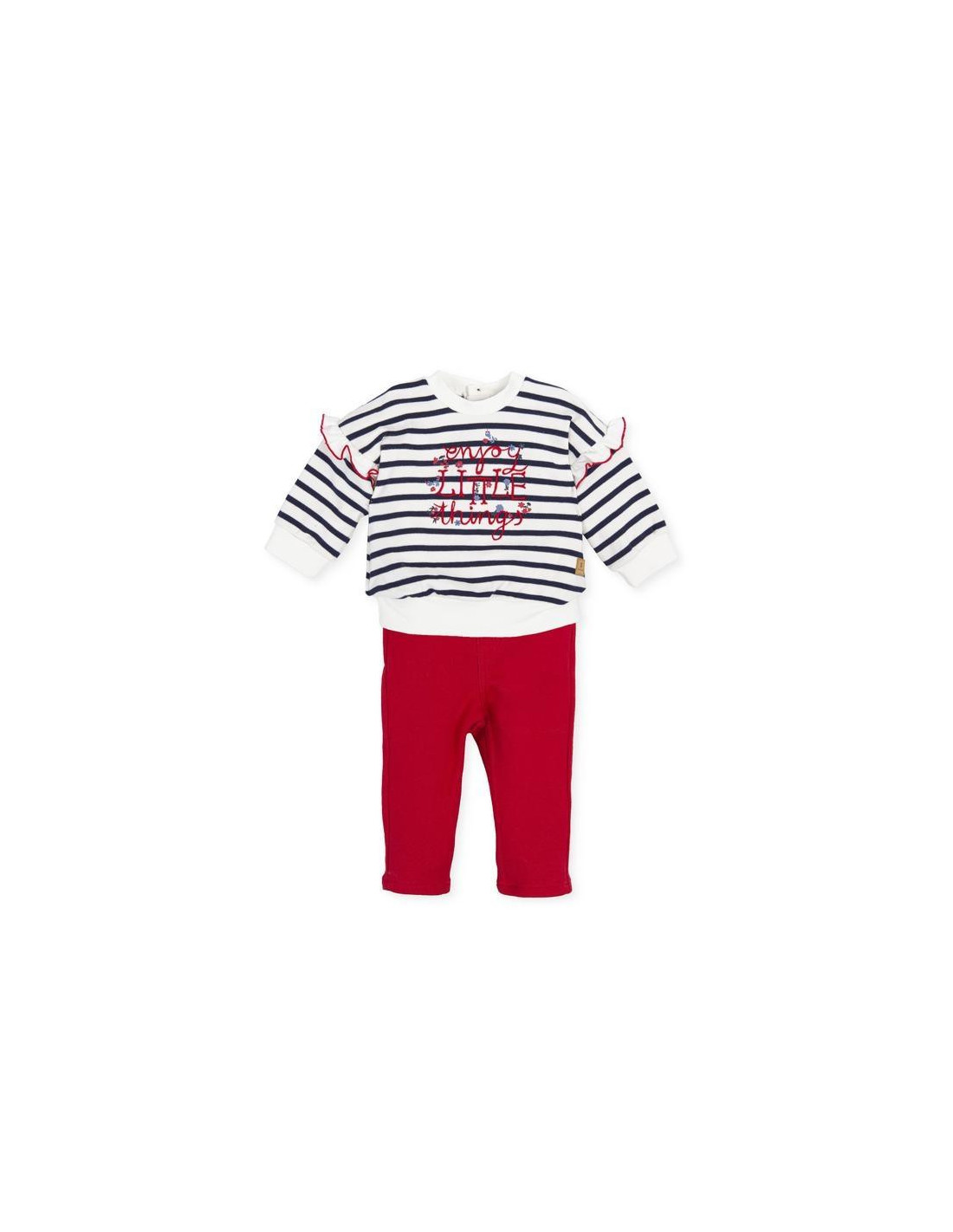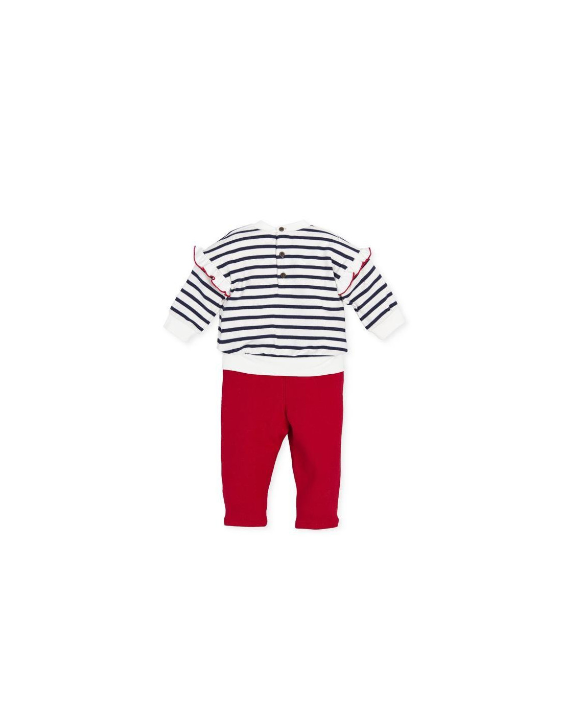 Dos piezas en interlock rayas marino con cuello, puños y bajo de canalé. Detalle volantes en mangas. Abertura trasera con botón. Pantalón en interlock rojo con suave elástico en cintura. Bolsillos y bragueta simulados.