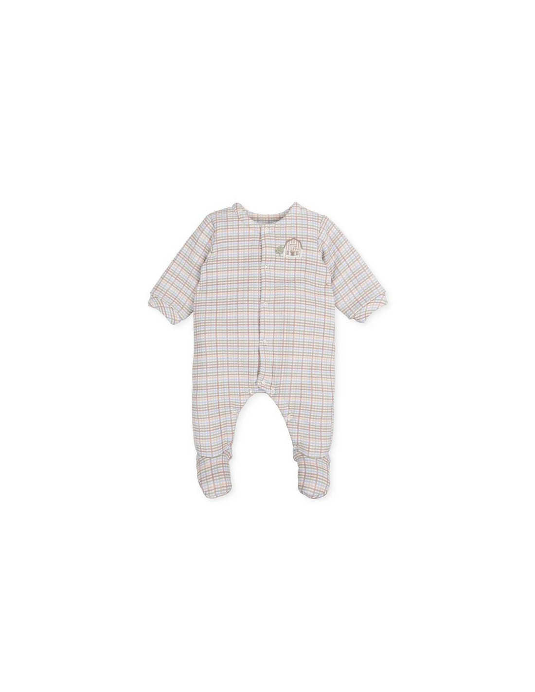 Pelele largo con pie en tejido interlock especial estampado cuadros con bordado casita. Abertura delantera y entrepierna con botones a presión.