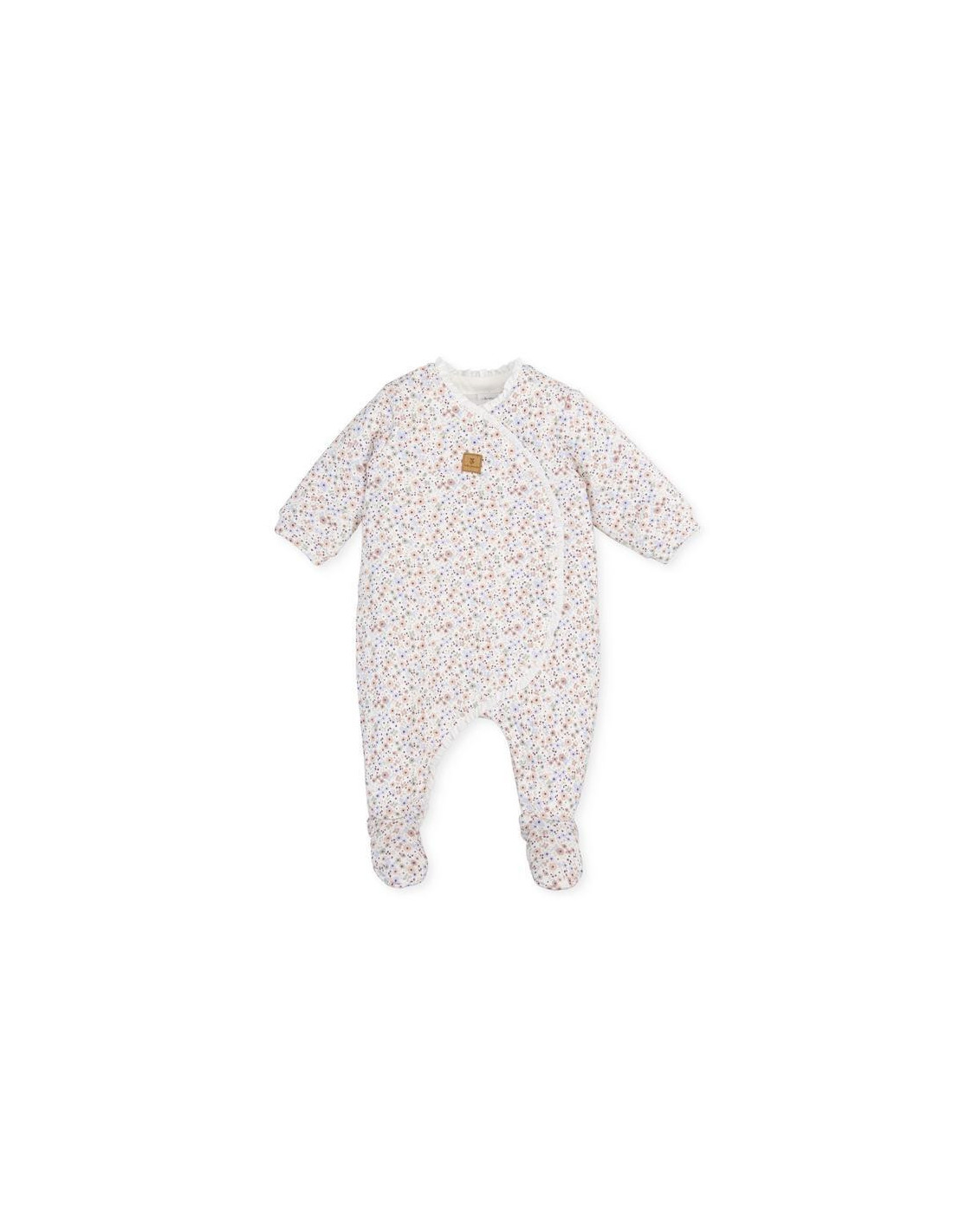 Pelele largo con pie en tejido interlock especial estampado flores. Abertura delantera y entrepierna con botones a presión.