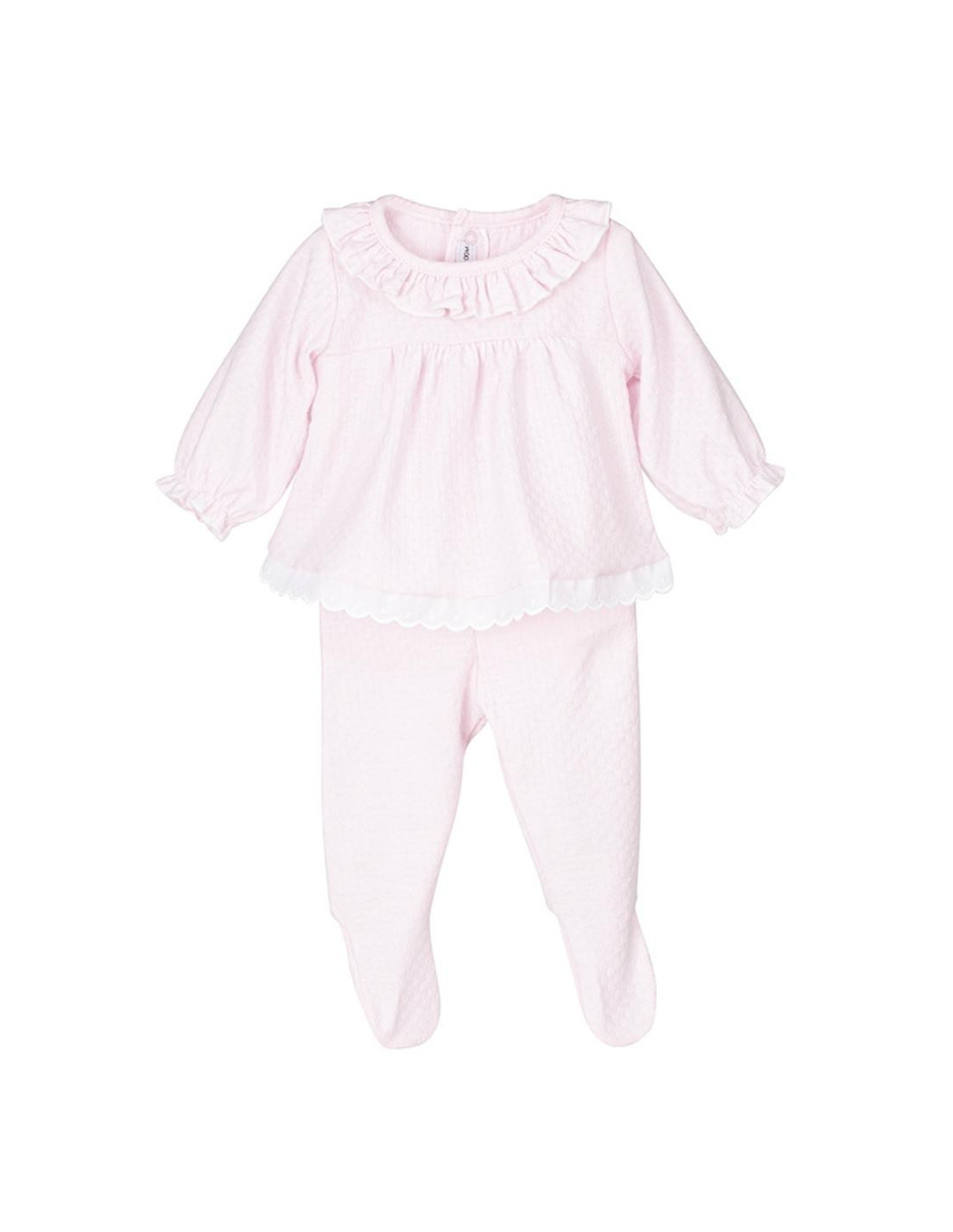 Conjunto en algodón 100% camiseta manga larga abierta con corchetes por la espalda y polaina con elastico en la cintura,