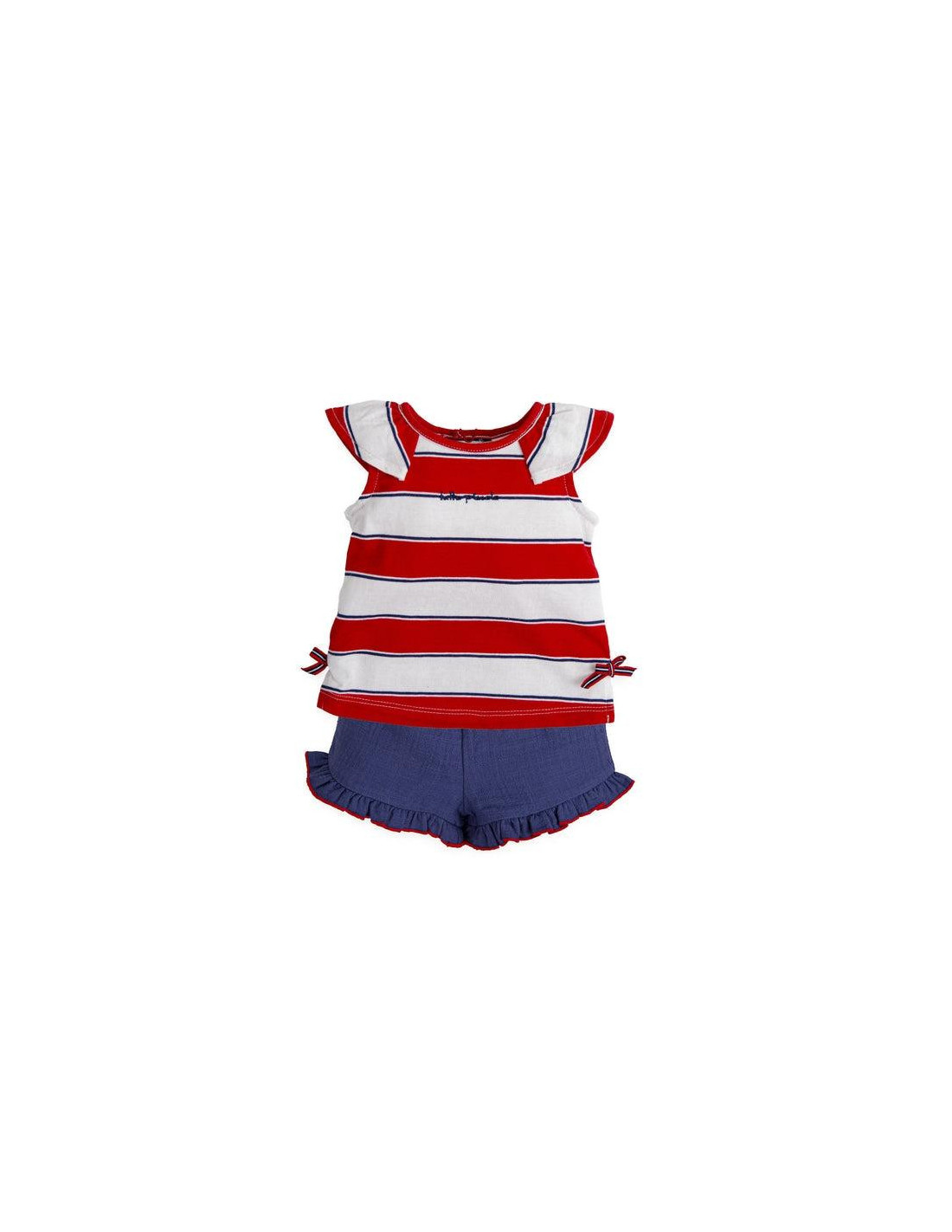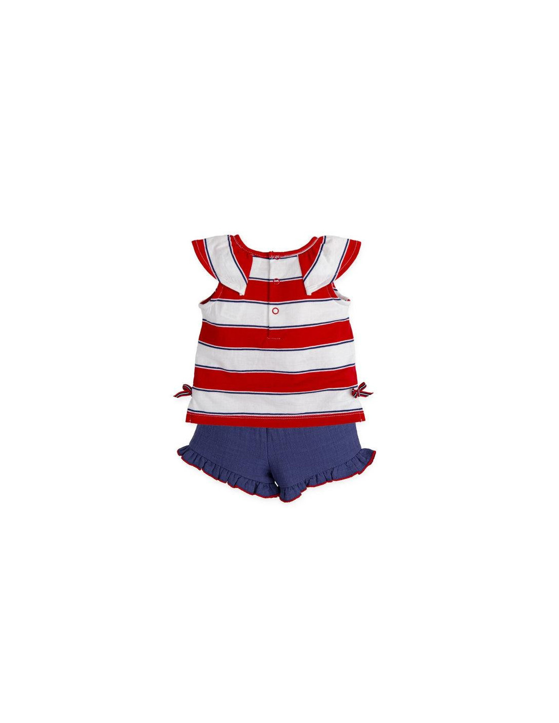 Dos piezas de punto liso rayas en color rojo y blanco, pantalón de fil a fil en azul marino con elástico en cintura.