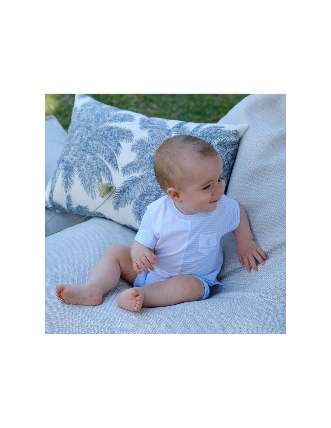 Dos piezas manga corta de punto liso blanco combinado con rayas en celeste. Abertura en hombro con botón a presión. Pantalón de punto liso celeste con suave elástico en cintura y vuelta en el bajo.
