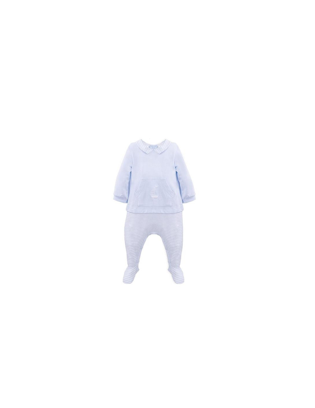 Pelele de punto liso celeste combinado con rayas. Detalle bolsillo en el delantero. Abertura trasera y entrepierna con botón a presión.