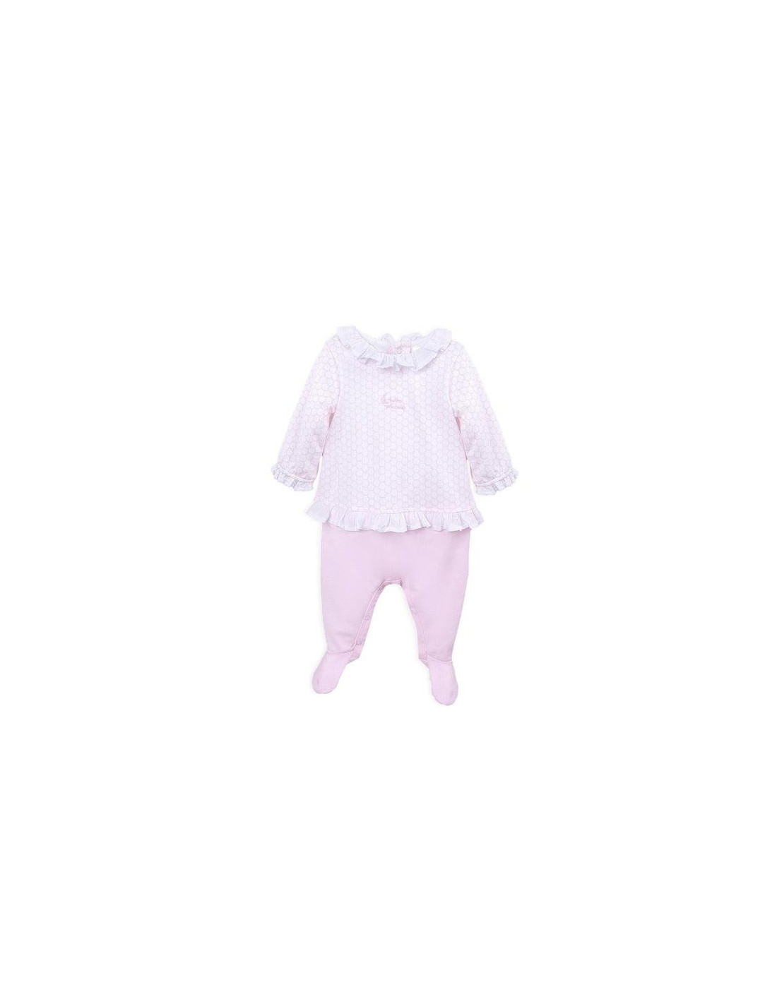 Pelele de punto liso estampado círculos en rosa combinado con liso. Volante en cuello, puños y cadera de plumetti blanco. Abertura trasera y entrepierna con botones a presión.