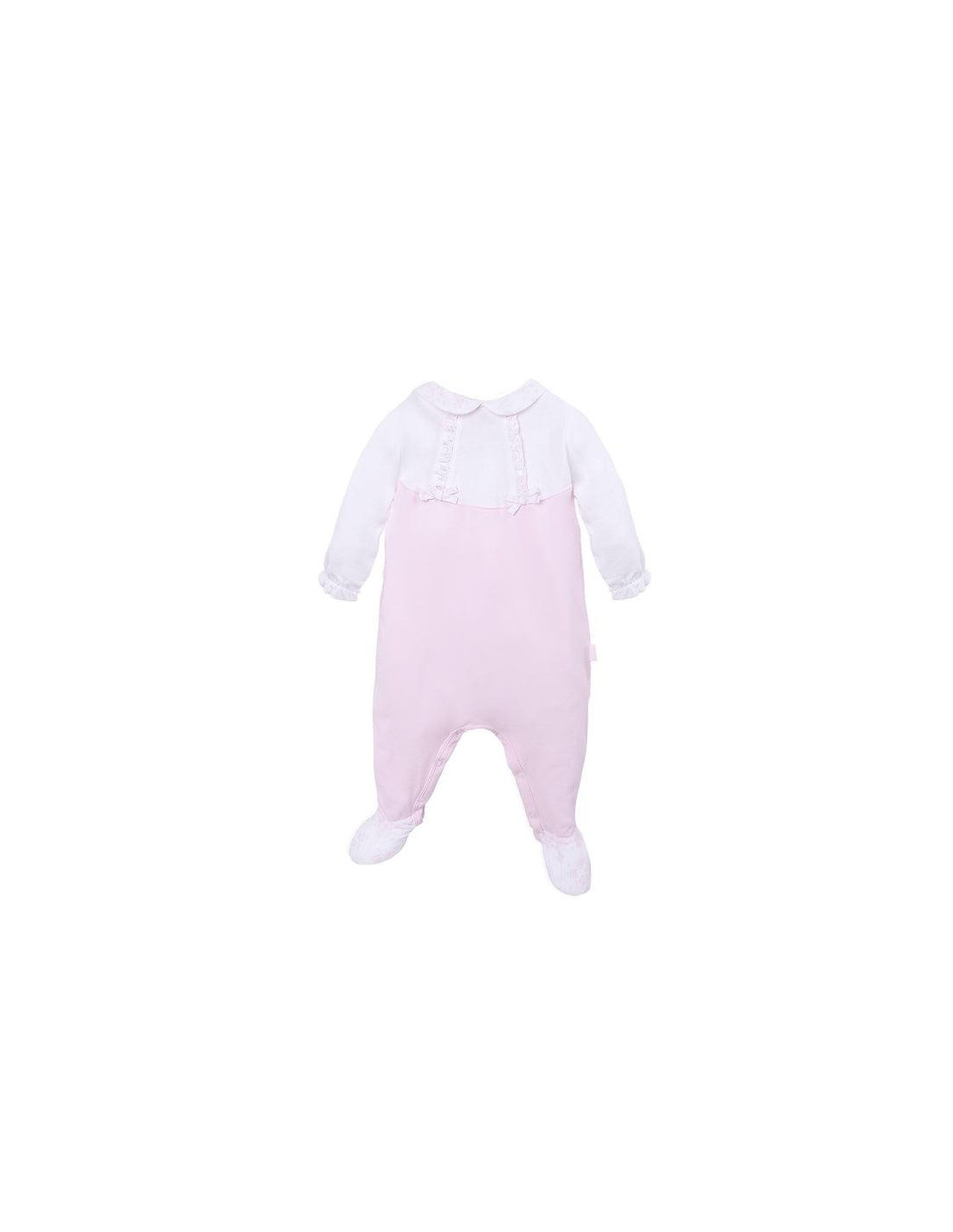 Pelelede punto liso blanco y rosa con elastómero. Detalle de volantes en popelín estampado flores en el delantero. Suave elástico en puños. Abertura trasera y entrepierna con botones a presión.