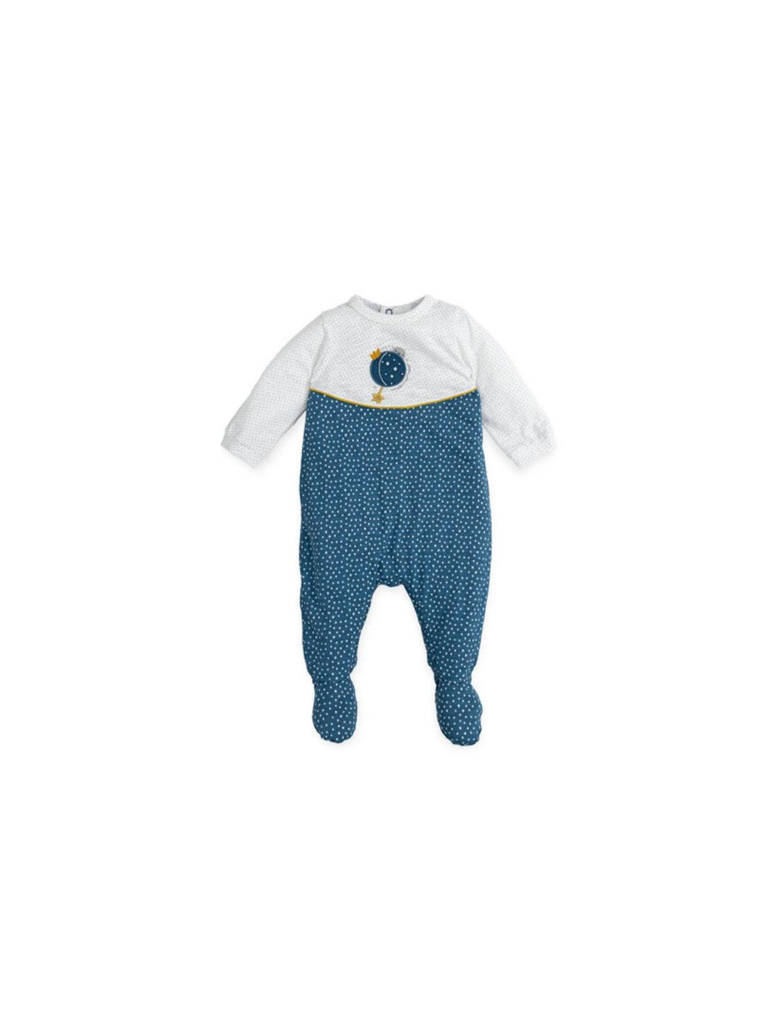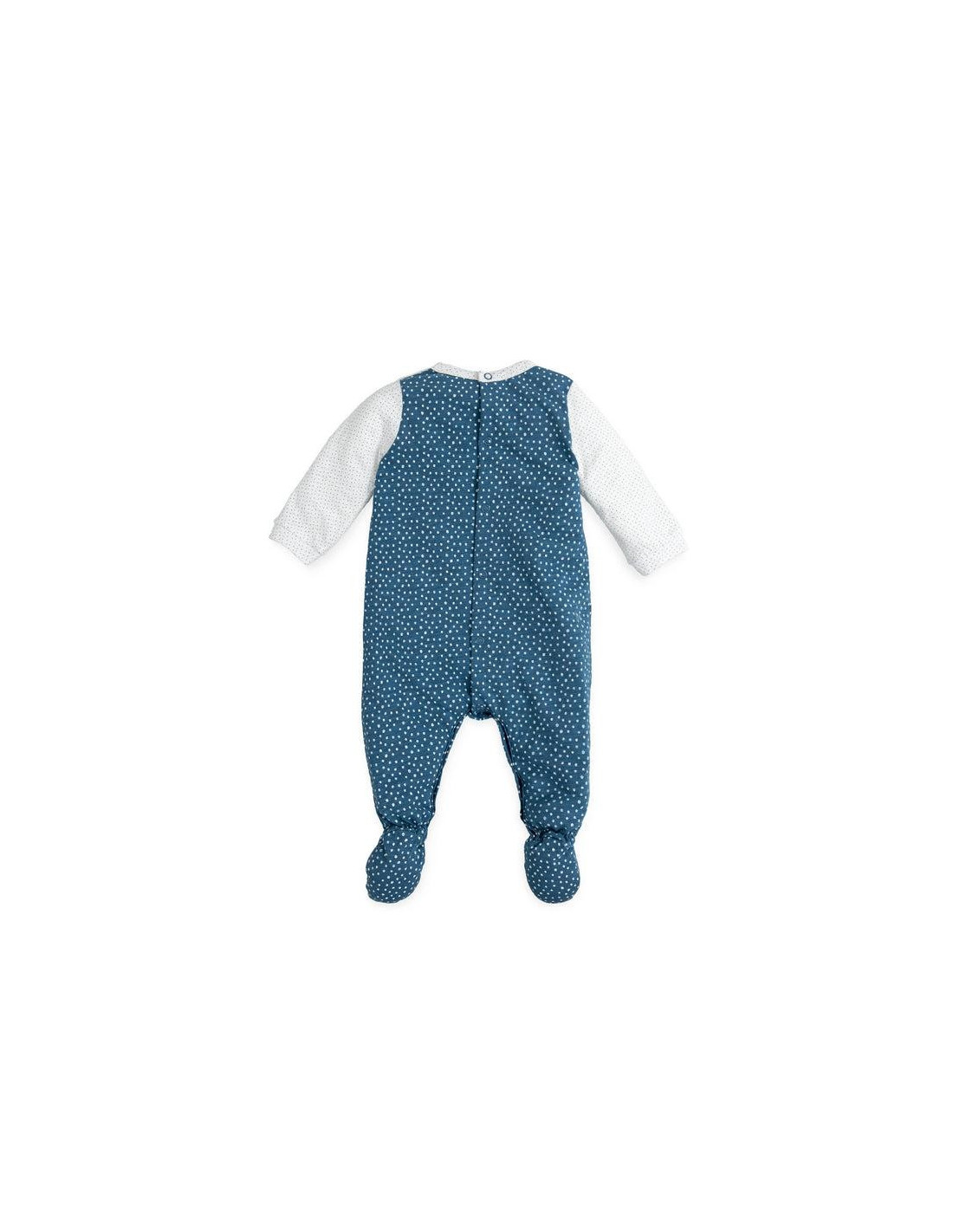 Pelele de punto liso flamé estampado motas combinado con blanco y azul. Detalle bordado. Abertura trasera y entrepierna con botones a presión.