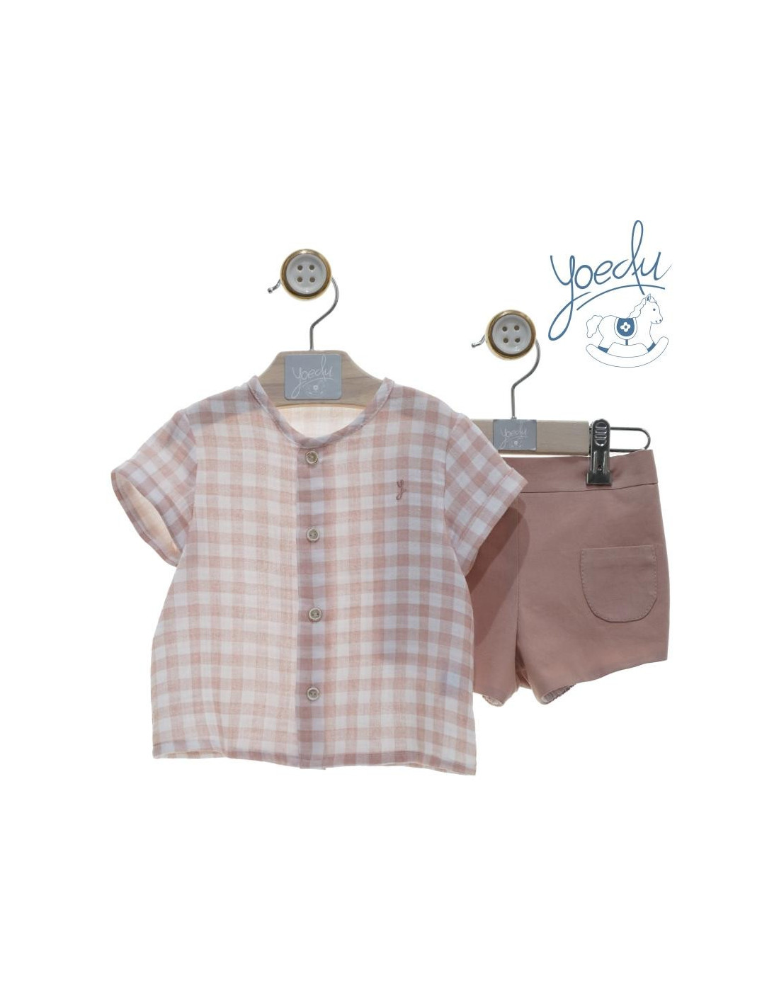 Camisa manga corta cuadros vichi rosa maquillaje, con pantalon corto a juego.
