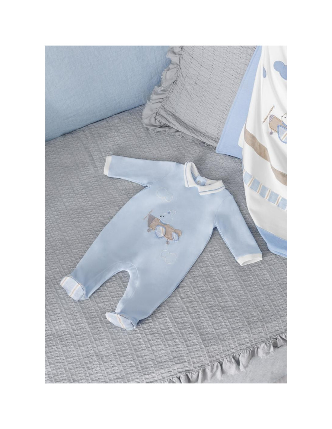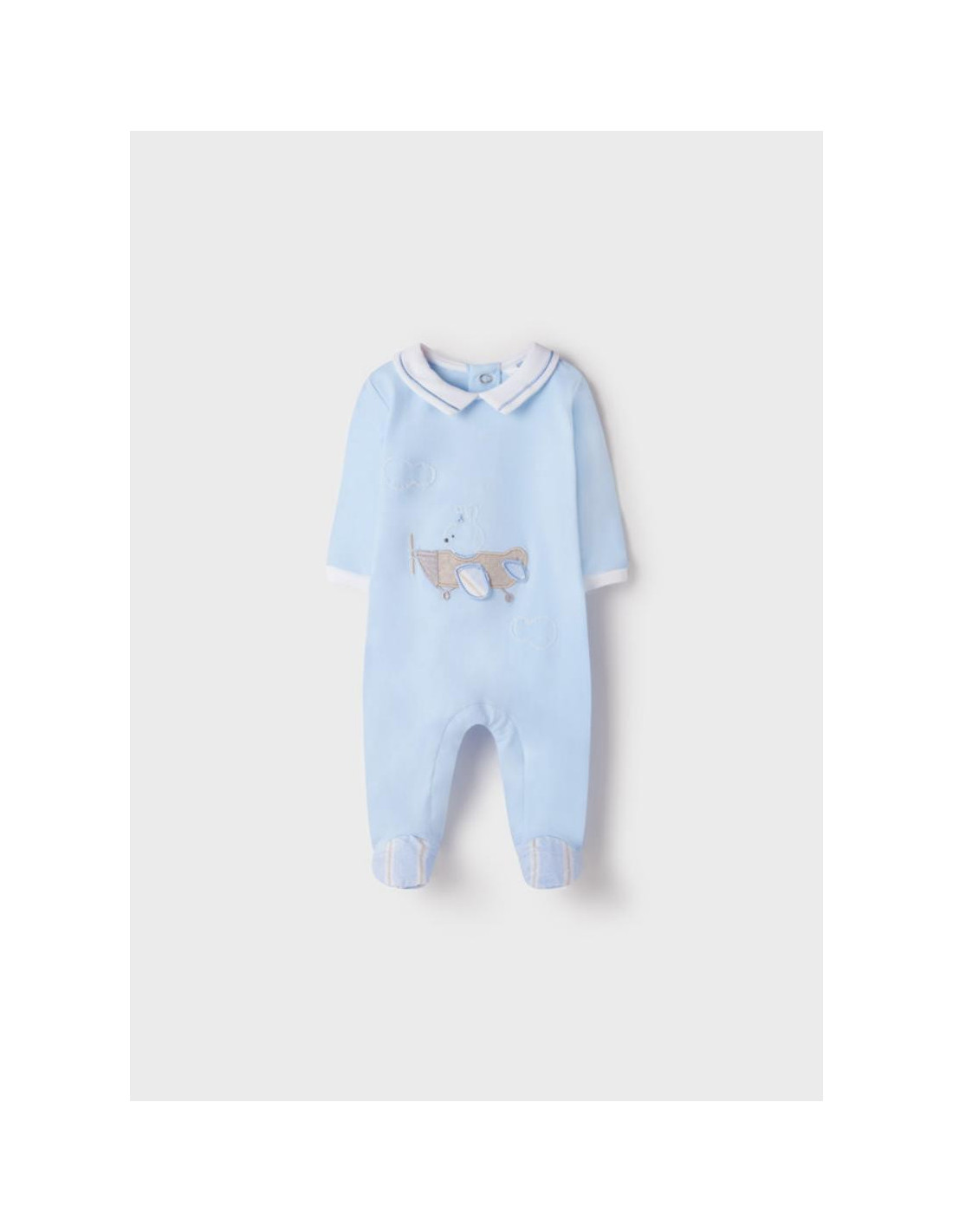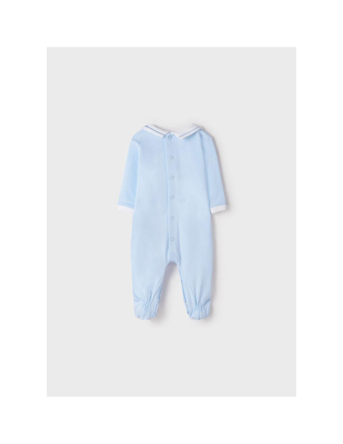 Pelele de manga larga para recién nacido niño con detalles a contraste. Cuello de polo con detalles en distinto color. Cierre con botones a presión en la parte posterior para facilitar la puesta de la prenda. Cómodo tejido de punto. Elementos de adorno: bordado.