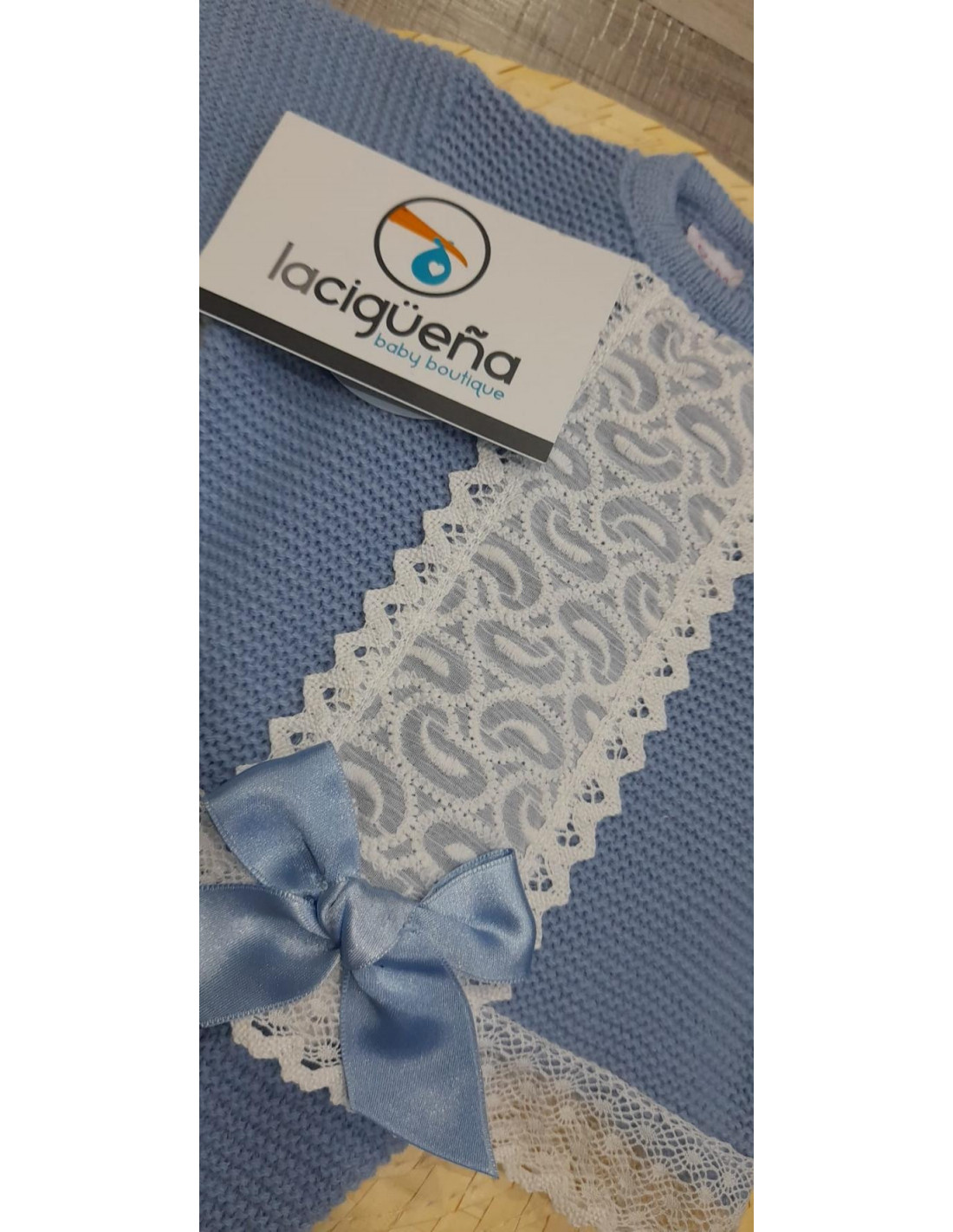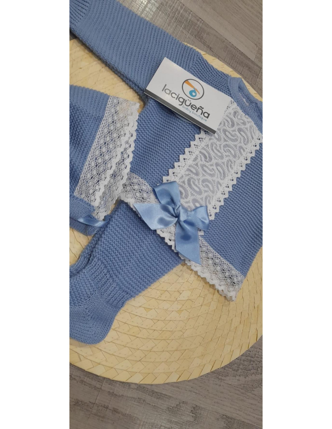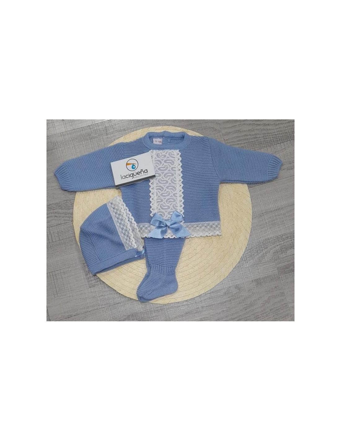 Conj. 3 piezas lana tachon encaje vertical azul.