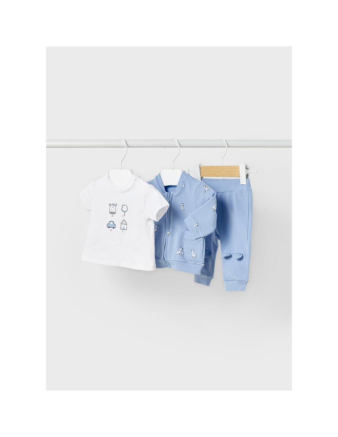 Prenda ECOFRIENDS, contiene algodón sostenible. Chándal de tres piezas para recién nacido compuesto por una sudadera, un pantalón largo deportivo y una camiseta a juego.