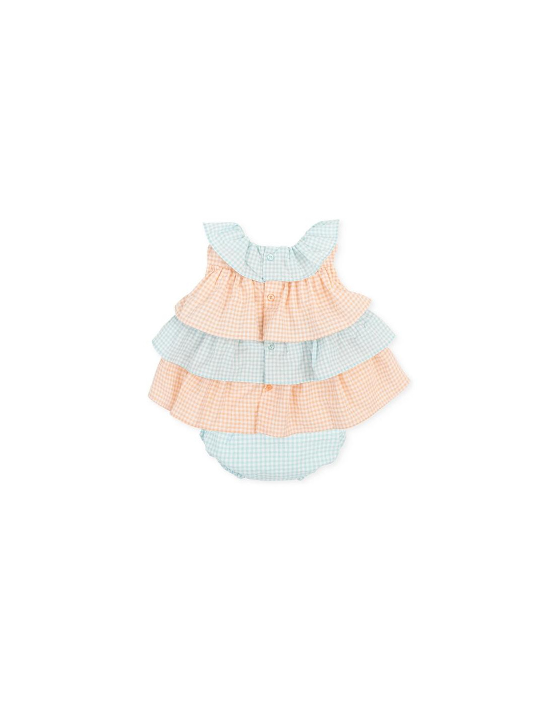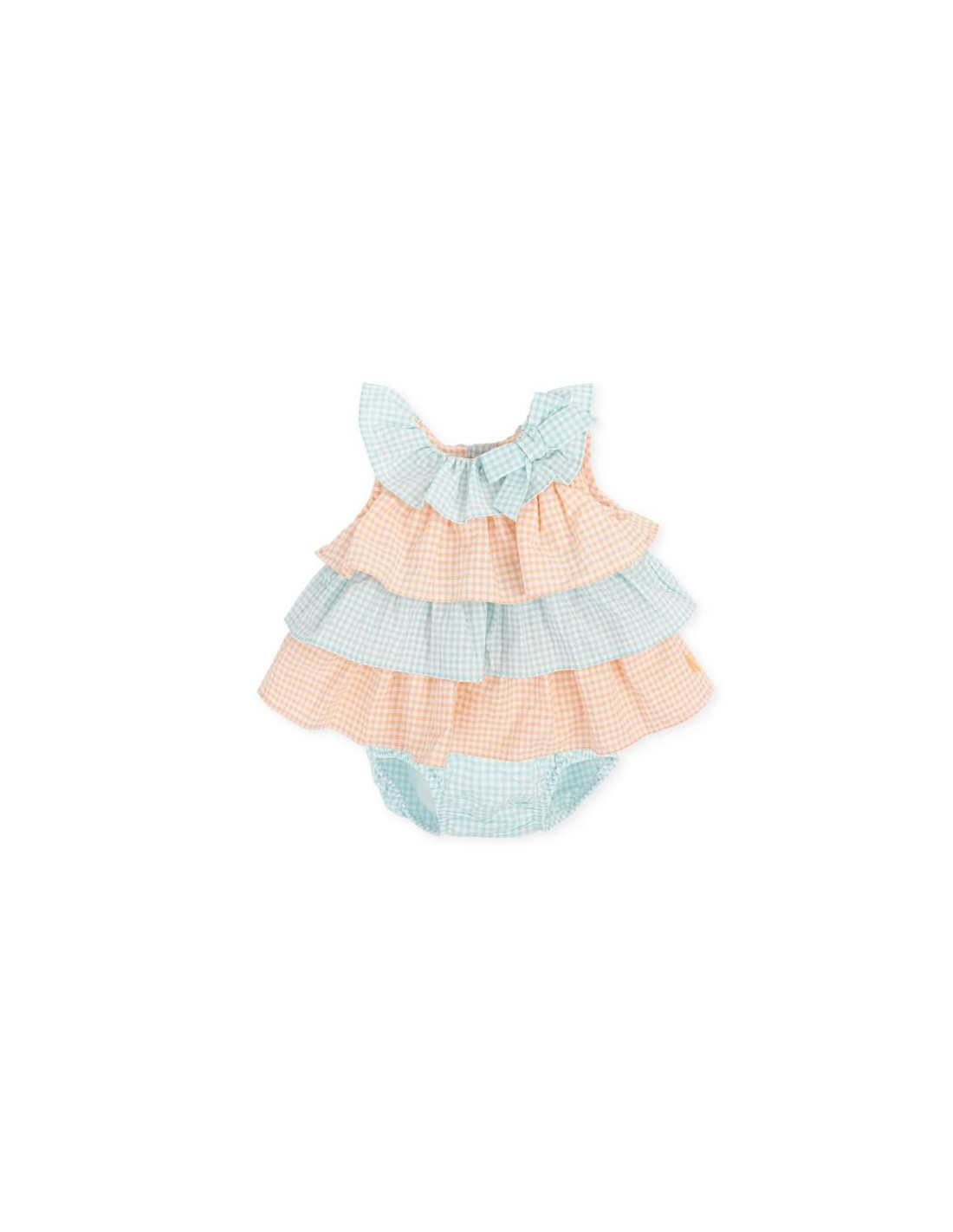 Vestido volantes sin manga cuadros vichi combinado en naranja y turquesa.