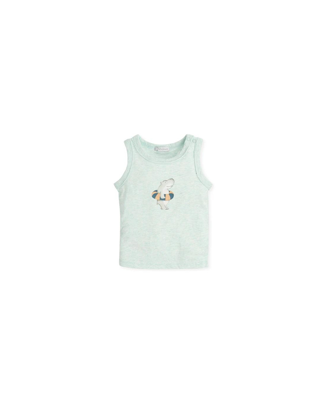 Camiseta s-m de punto liso verde claro. Detalle hipopótamos con flotador estampado. Abertura hombro con botón a presión.