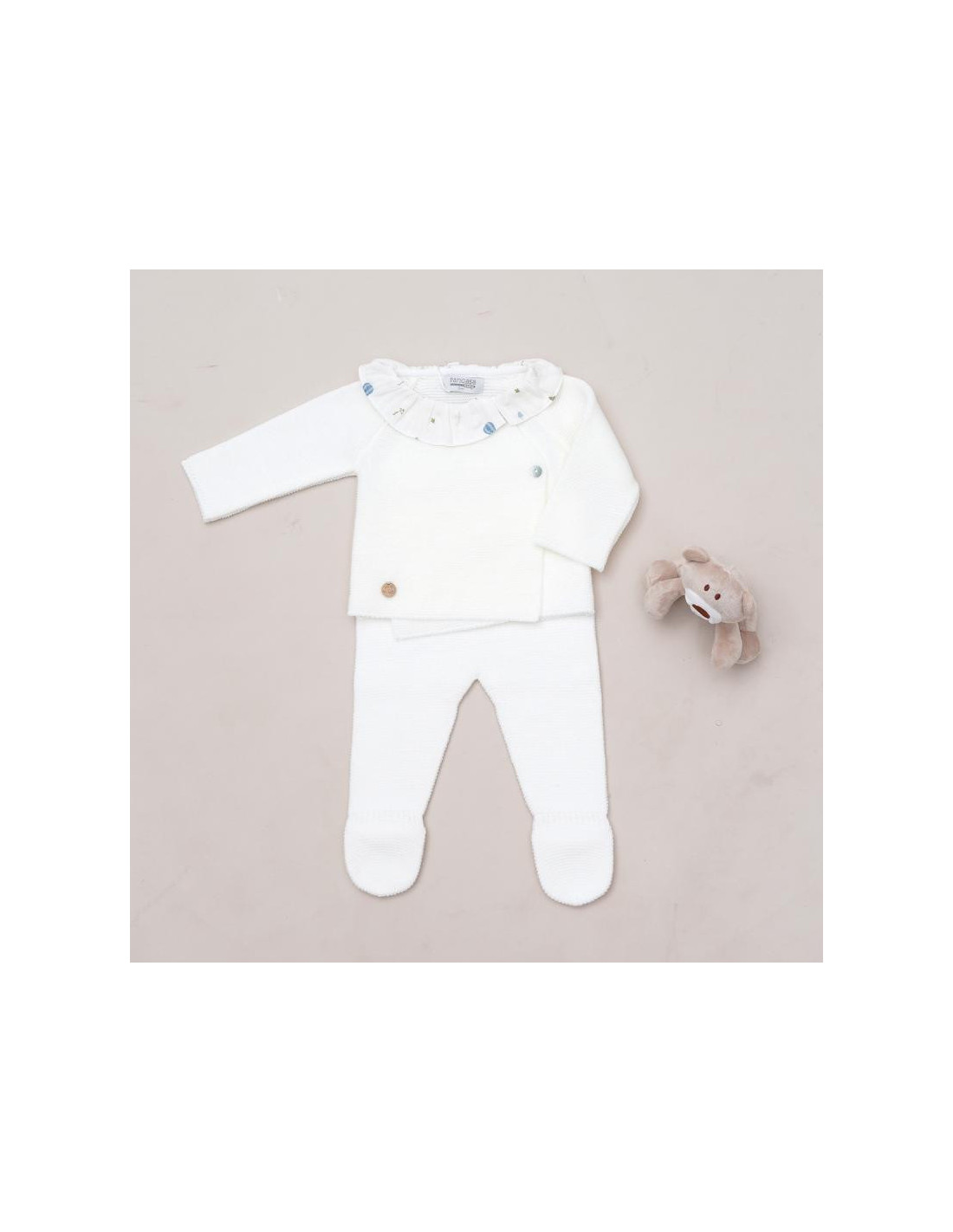 CONJUNTO 3 PIEZAS LANA GLOBOS BEIG CUELLO CELESTE PANGASA
