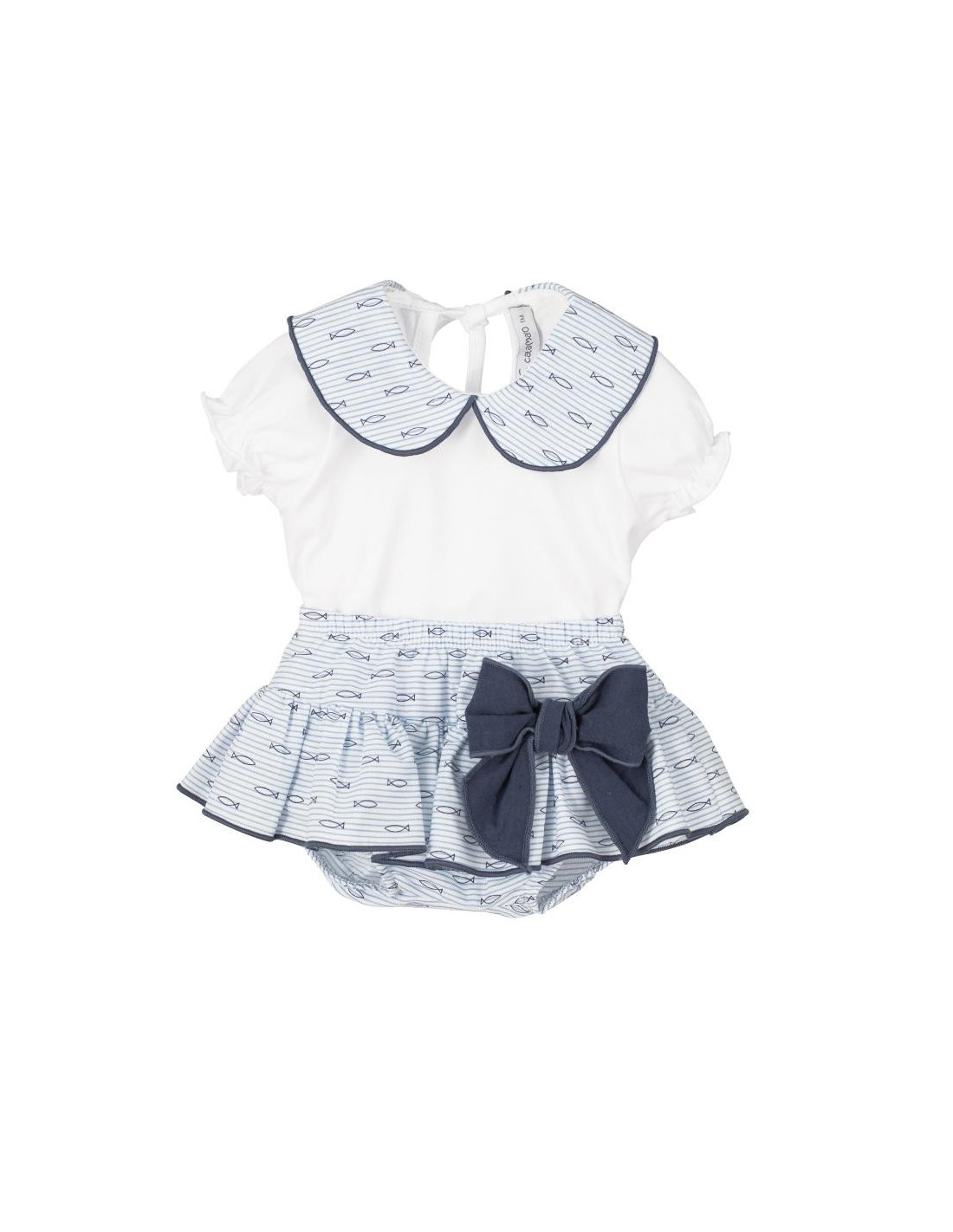 Camiseta algodón manga corta, con braguita en tejido con volantes y lazitos.