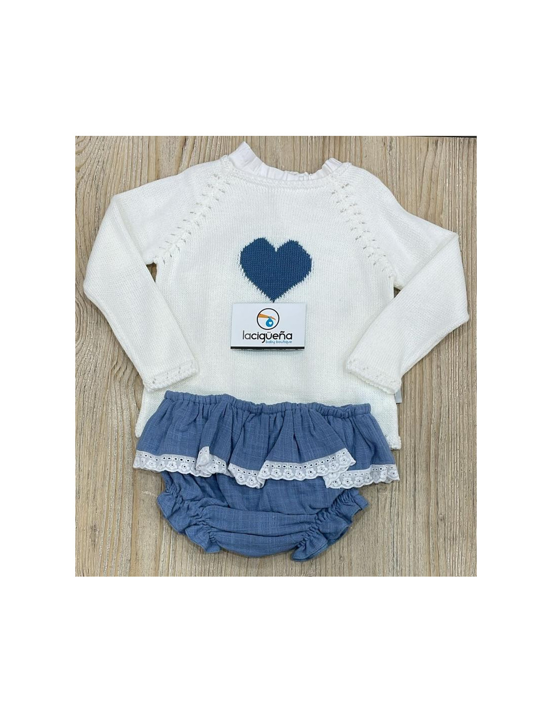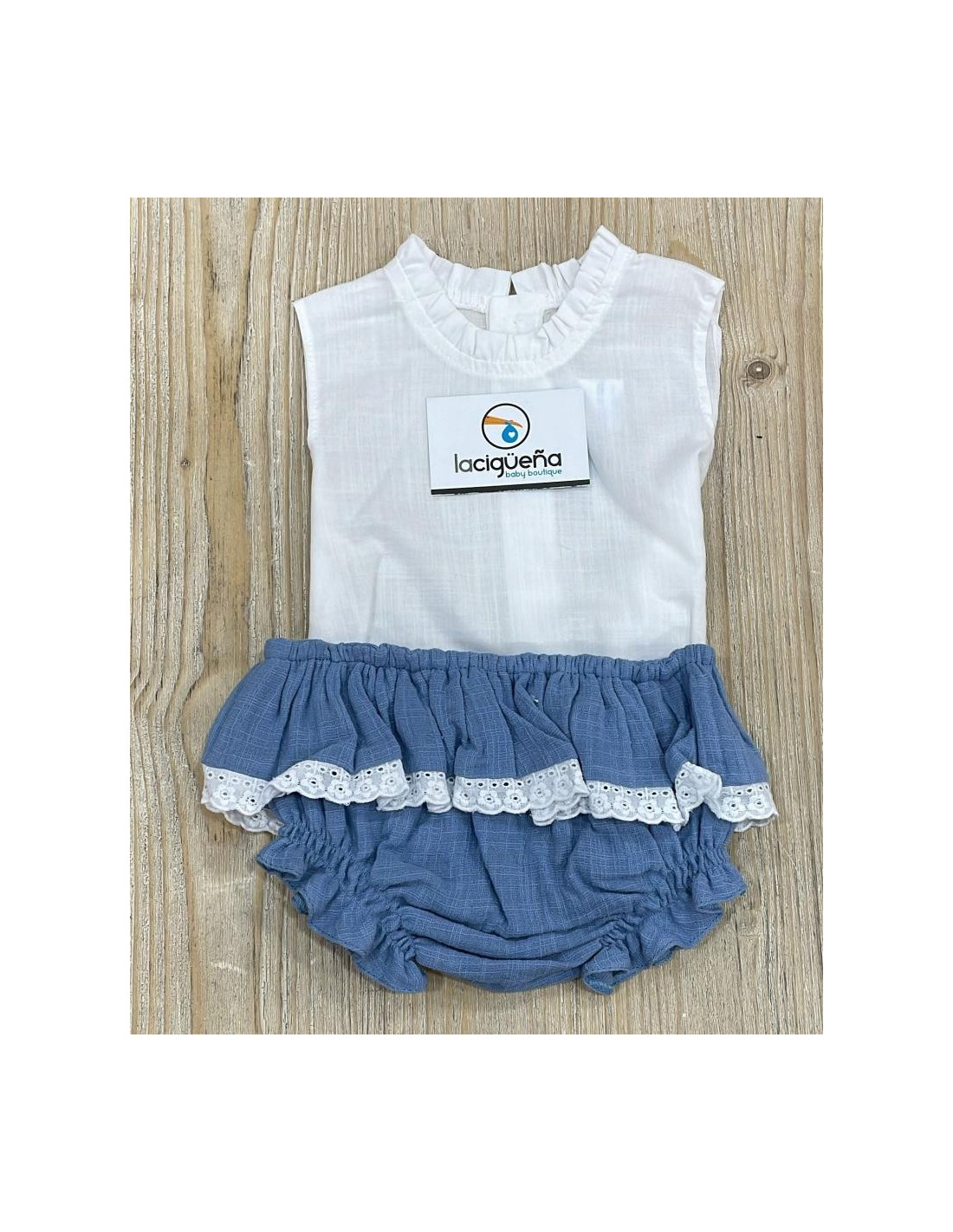 Jersey hilo manga larga con camisa batista sin manga y braga de volantes en color vaquero.