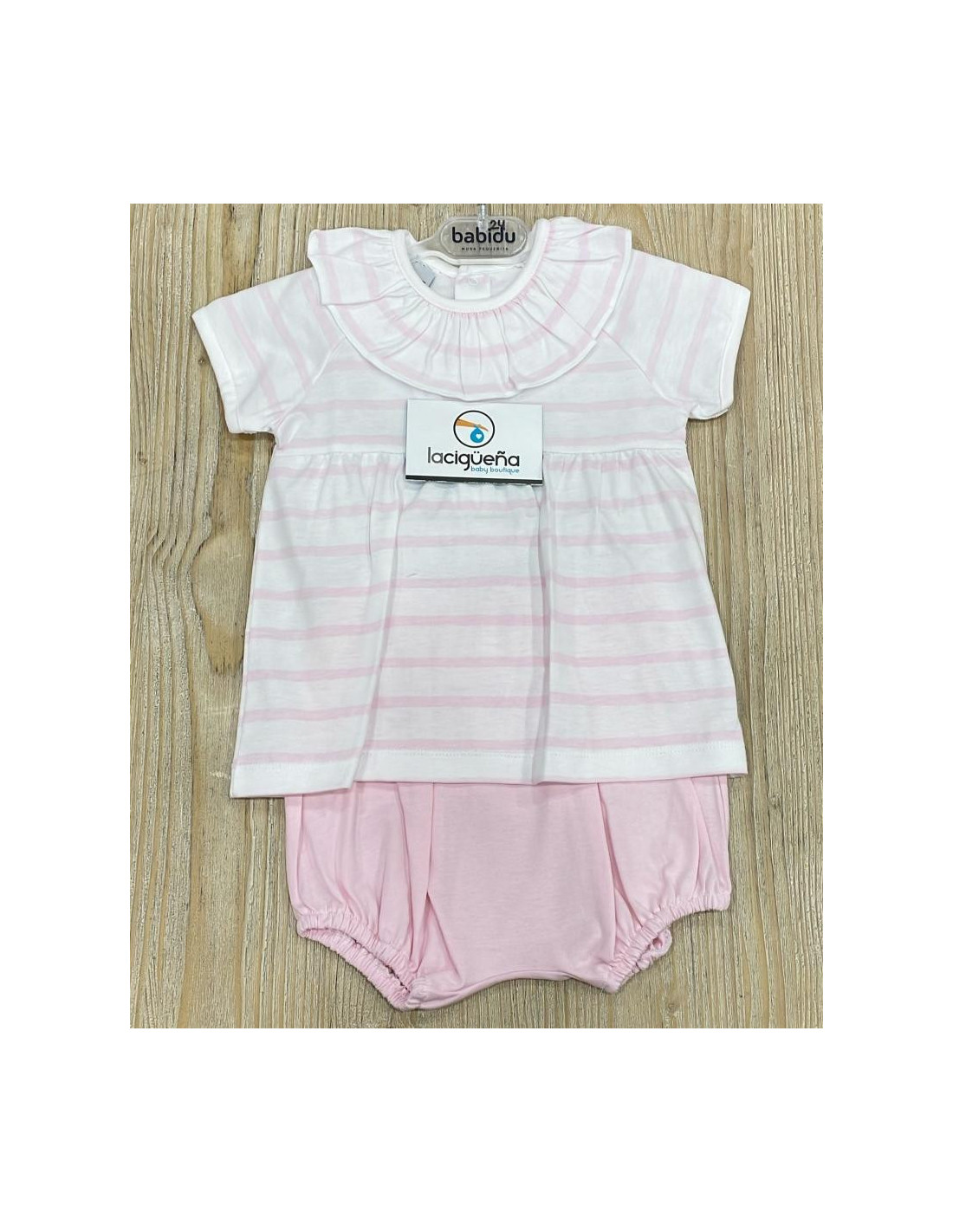 Camiseta algodon rayas cuello volante con braguita rosa en algodón 100%