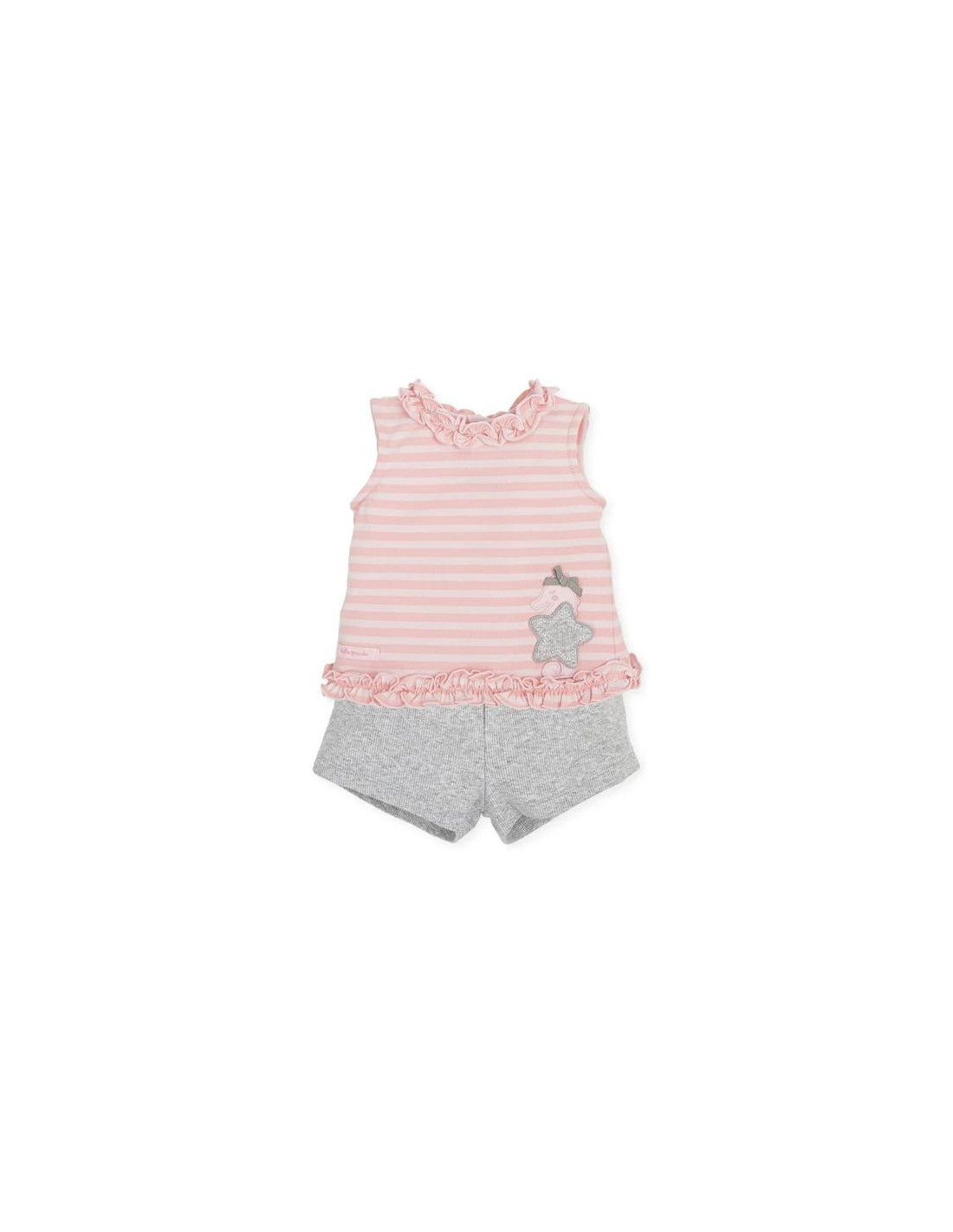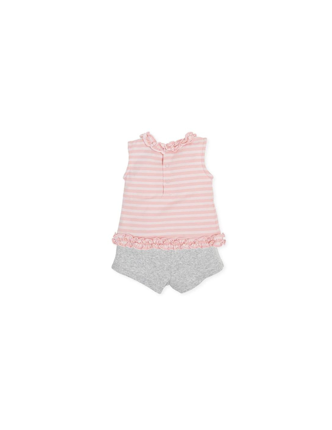 Dos piezas s-m en punto liso rayas pétalo combinado con canalé pétalo. Pieza fruncida alrededor del escote y bajo. Detalle caballito de mar y estrella bordada. Abertura trasera con botón a presión. Pantalón con suave elástico en cintura.