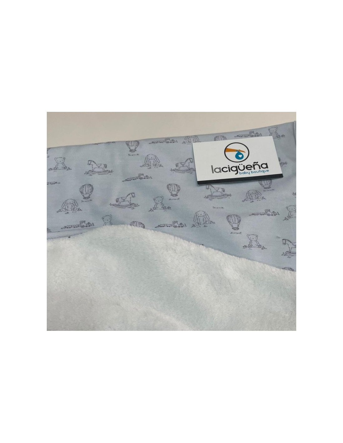 Arrullo reversible , una cara estampada con caballitos y globos 100% algodón y la otra cara polar blanco 100% acrilico.