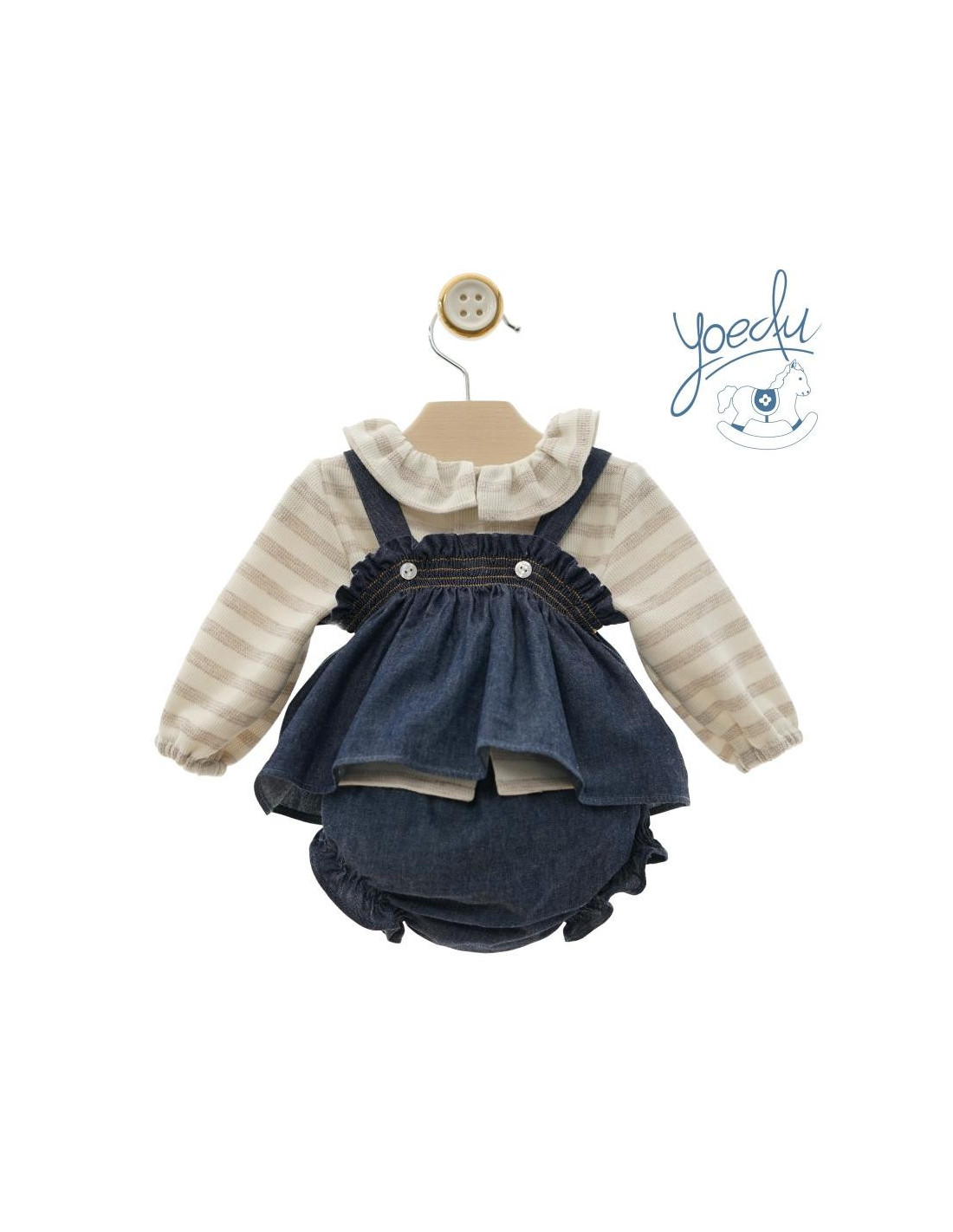 Peto tipo vestido con braga a juego en tejido vaquero muy suave.