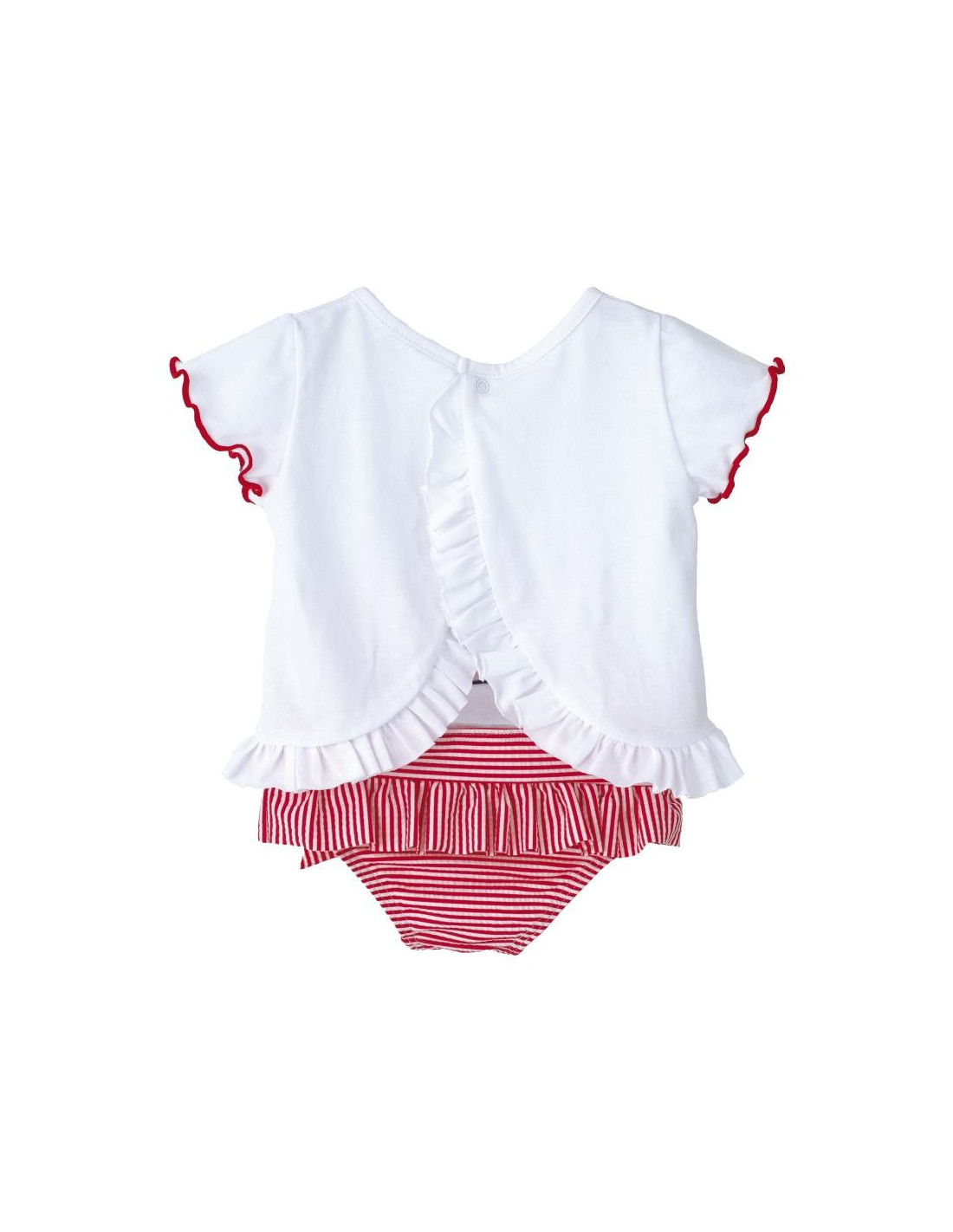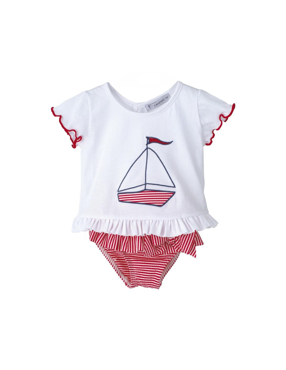 CAMISETA MANGA CORTA BARQUITO+BAÑADOR VOLANTE RAYAS ROJO CALAMARO
