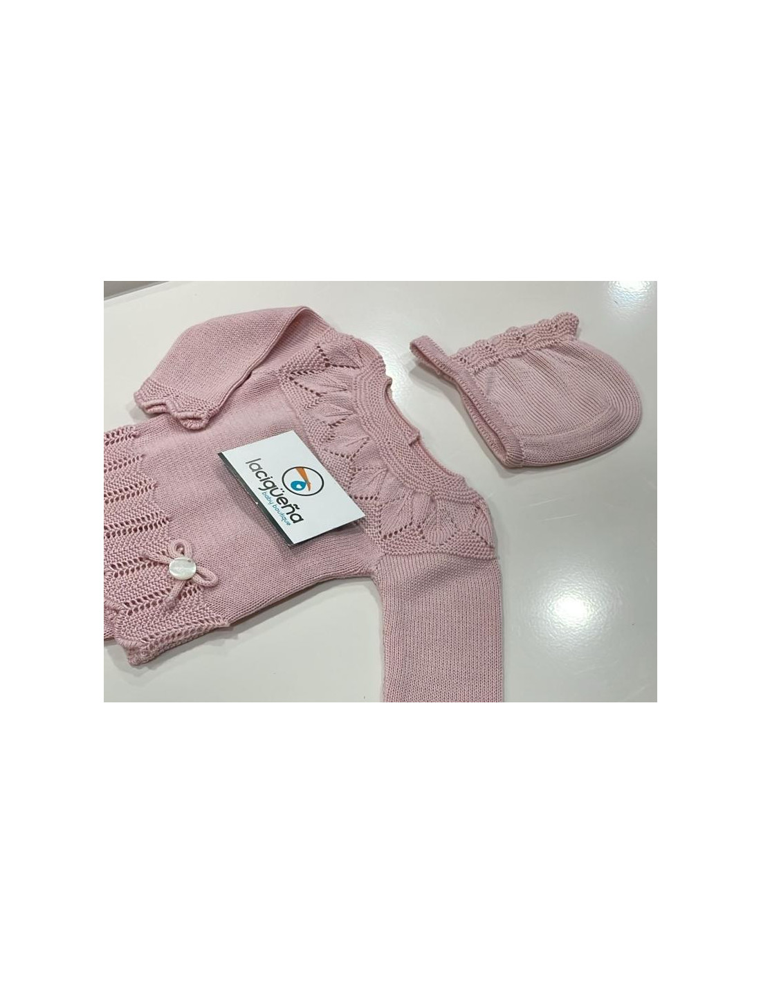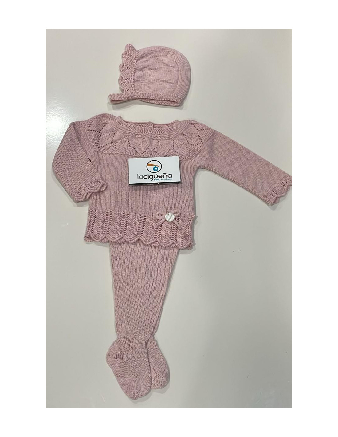 CONJUNTO HILO 3 PIEZAS MANGA LARGA HOJAS CUELLO ROSA PRIM BABY