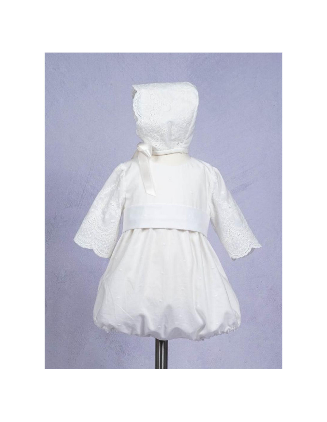 Pelele media manga de batista bordada con puntilla guipur. Gorro a juego.
