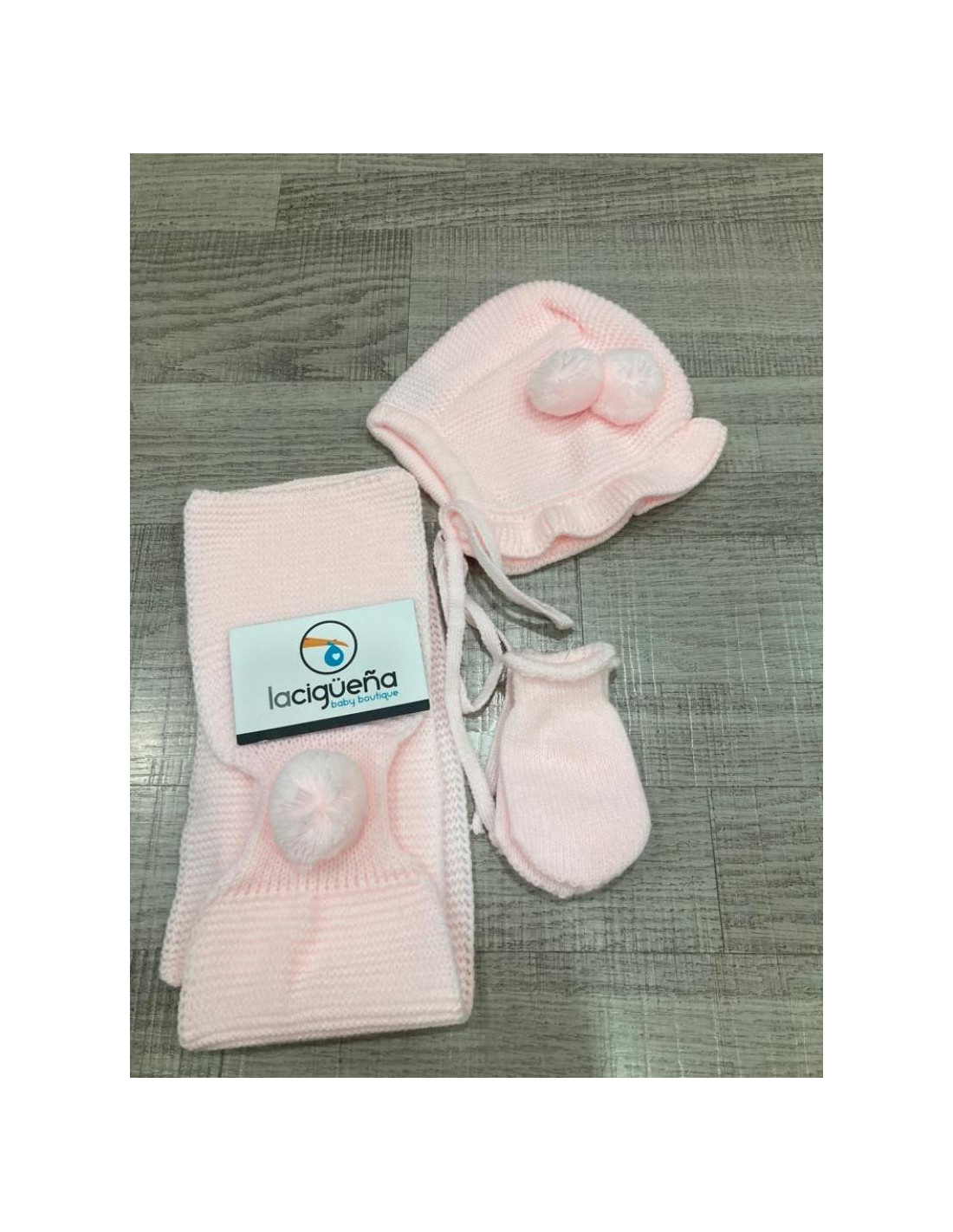 GORRO+BUFANDA+MANOPLAS POMPOM ROSA